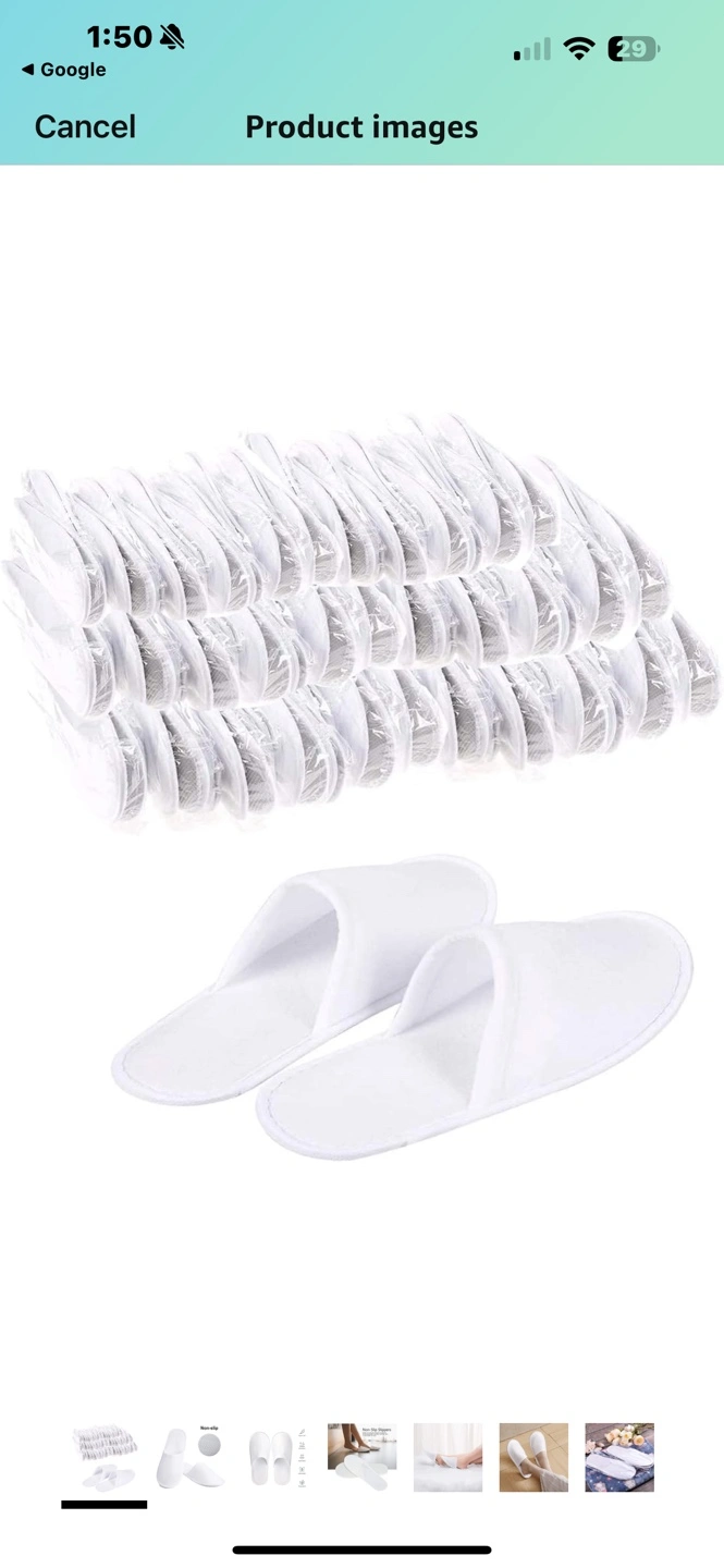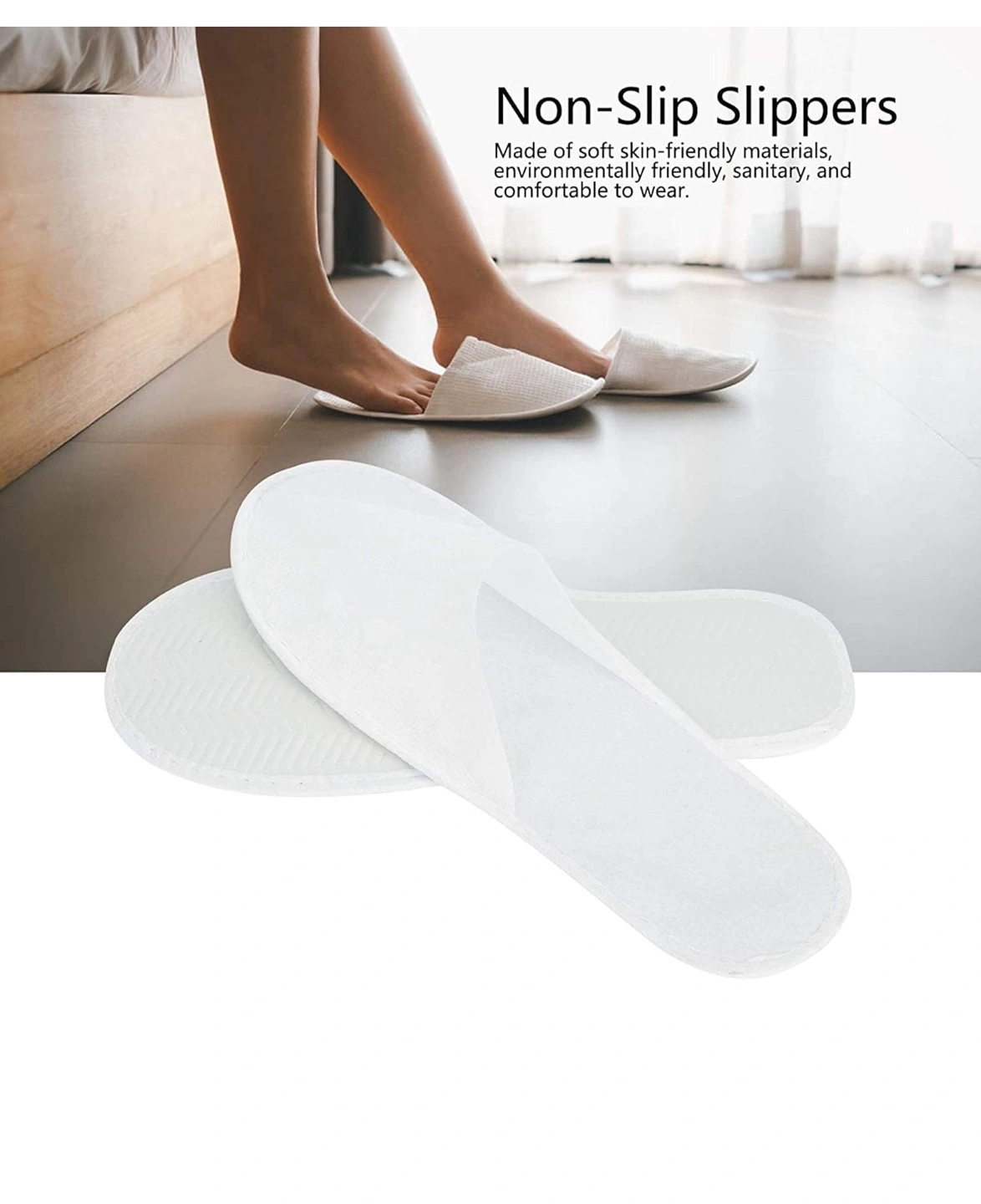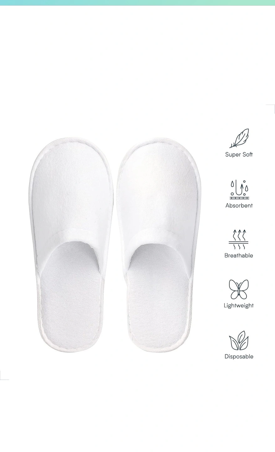 Package of disposable hotel slippers. White, soft, absorbent, and breathable. Lightweight and non-slip. Ideal for hotels, spas, or personal use. Bulk purchase. $2/pc $20/10pc