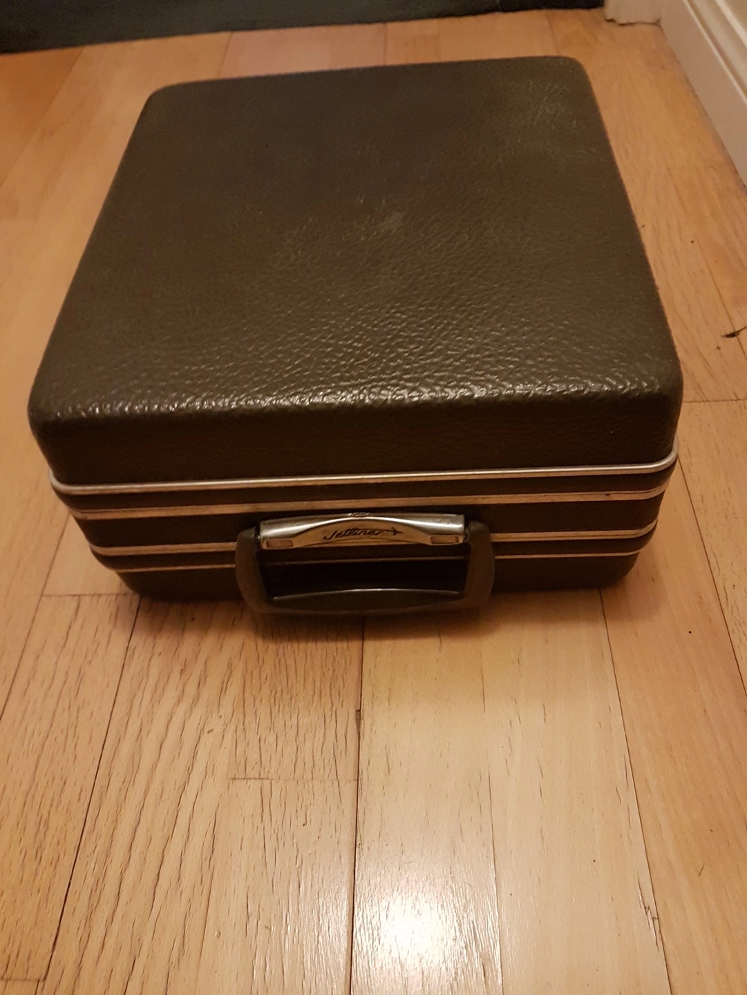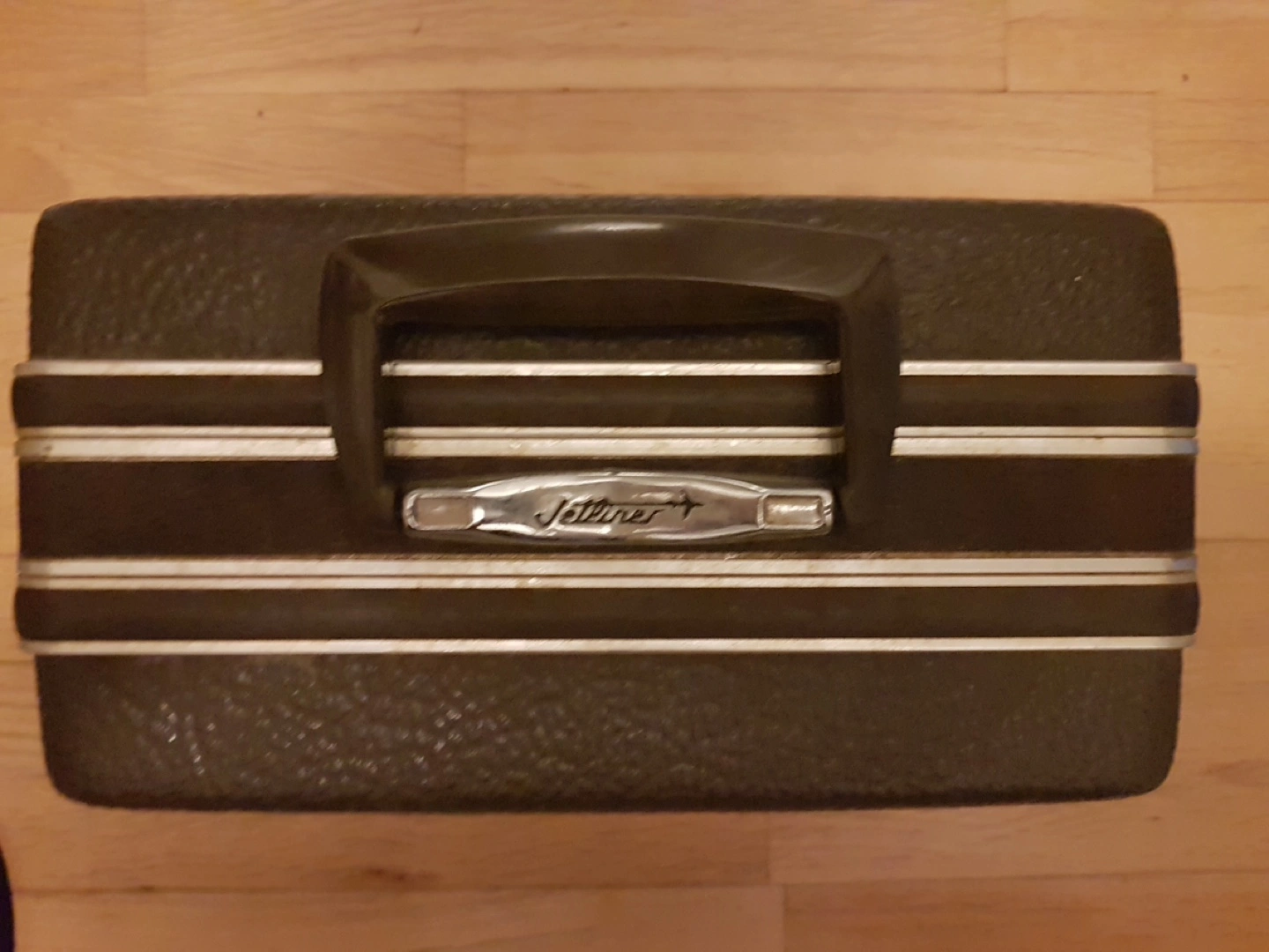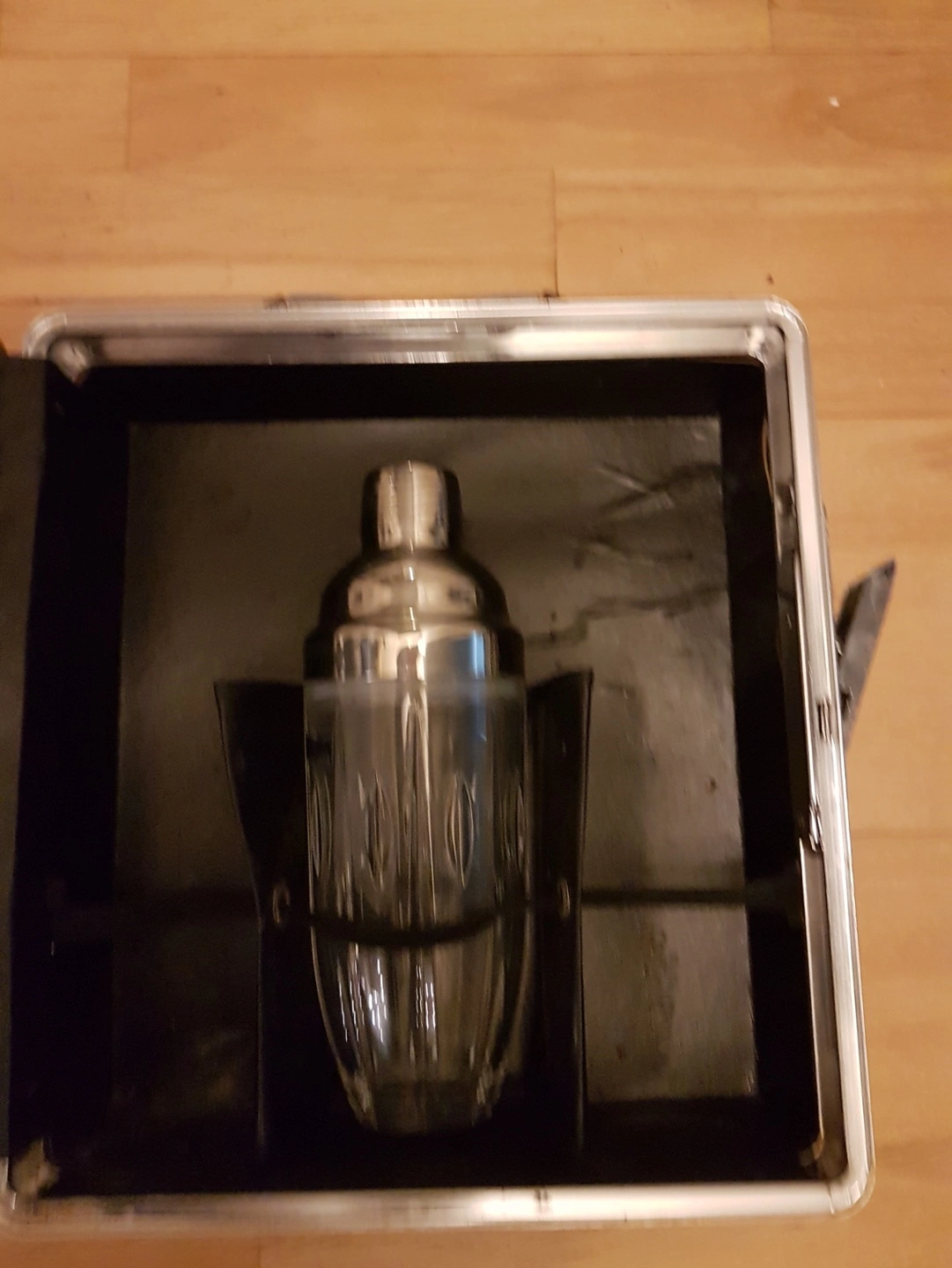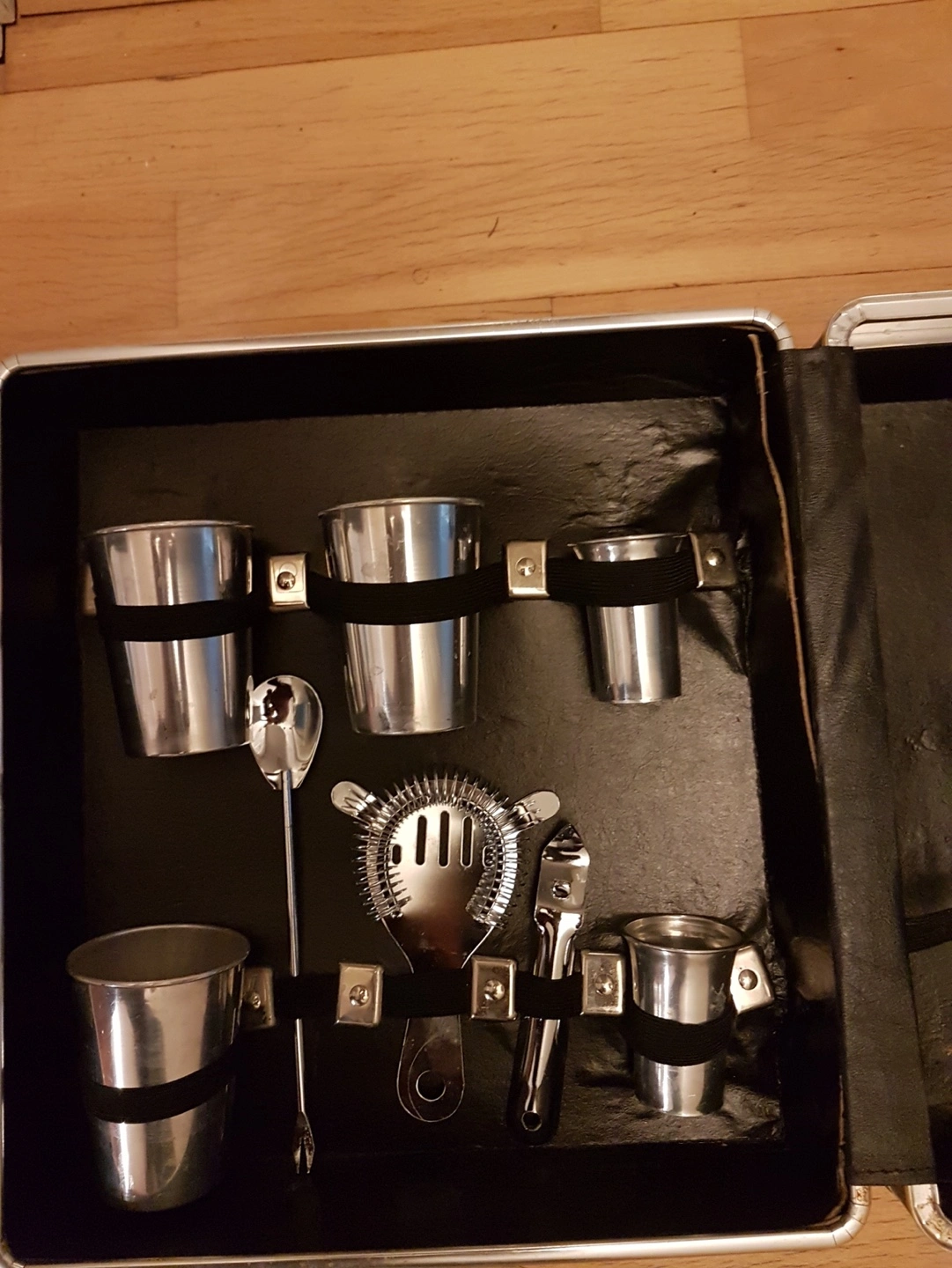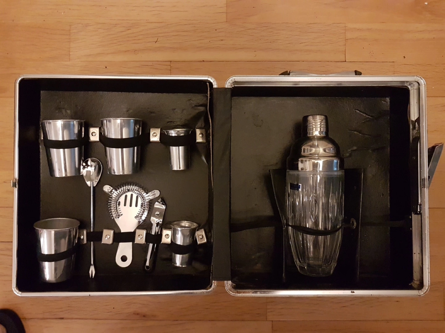 Vintage Jetliner cocktail shaker set. Includes shaker, jiggers, cups, strainer, and bar spoon. All housed in a portable carry case. Two extra spaces on either side of the shaker for you to add your favourite liquor and mix bottles. Good condition. Practical and functional for thirsty travellers.