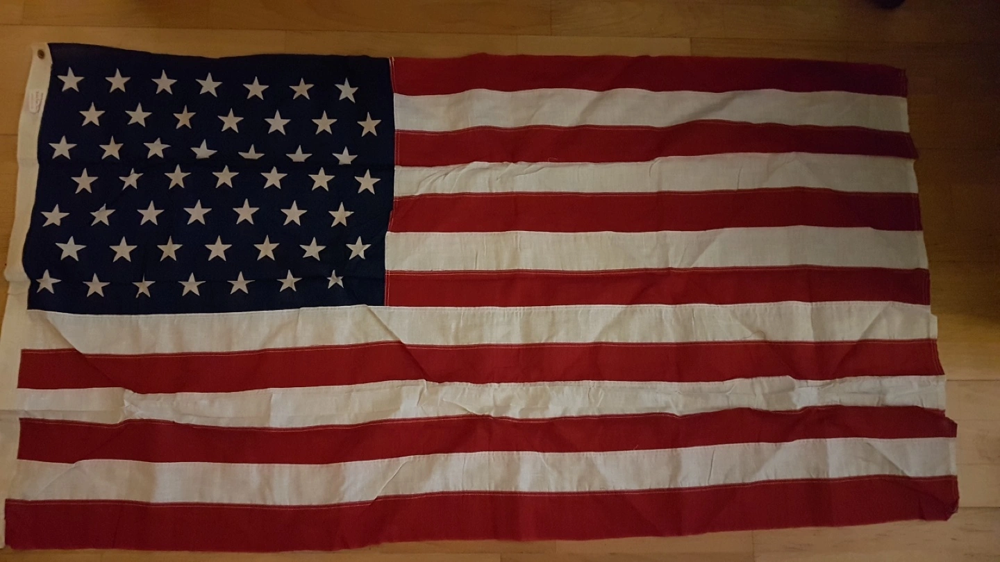 Large and rare vintage American flag. Flag Valley Forge Flag Co. Spring City, PA. (1959) Cotton bunting with grommets. 60” (L) x 31.5” (W) *Unfurled on Independence Day, July 4, 1959. This flag signified the admission of Alaska as a state. The 49 star flag was only used for one year, since on July 4,1960 a 50 star flag was adopted with the admission of Hawaii.