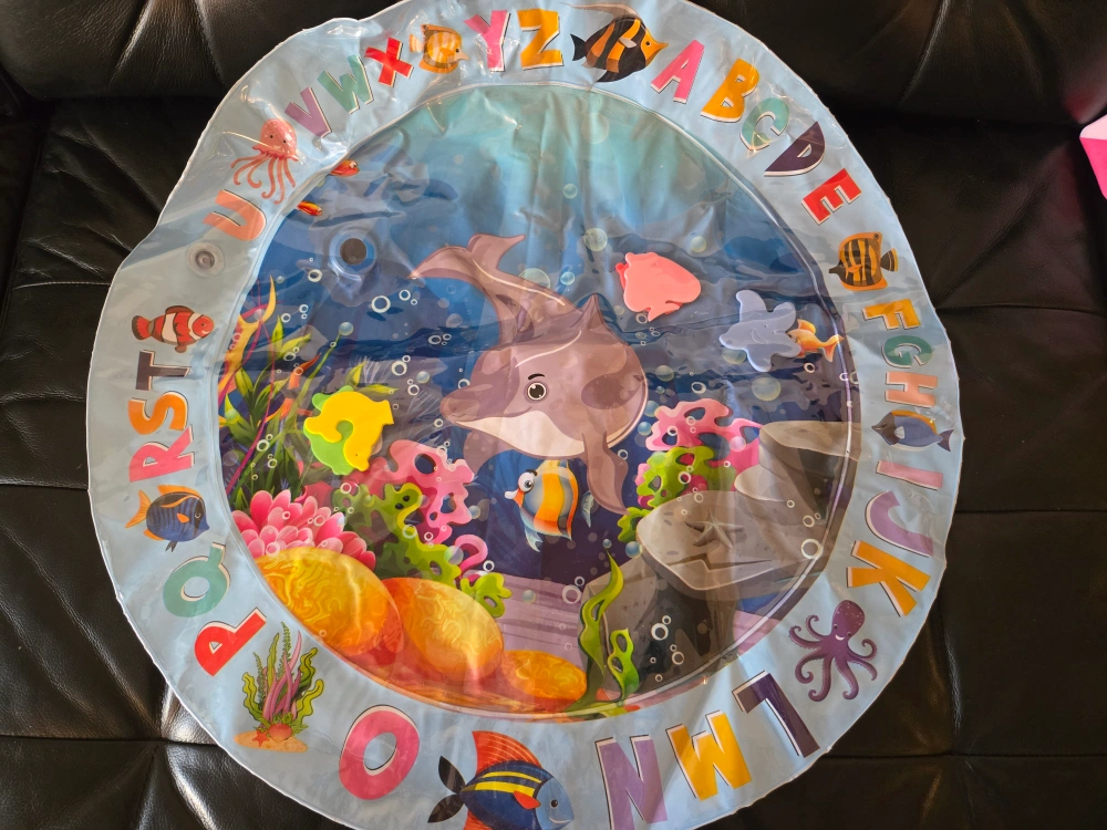 Fun and educational inflatable water play mat. Features colourful ocean scene, alphabet letters, and cute sea creatures. Used once.