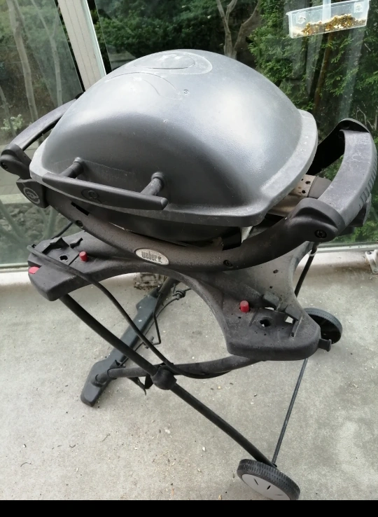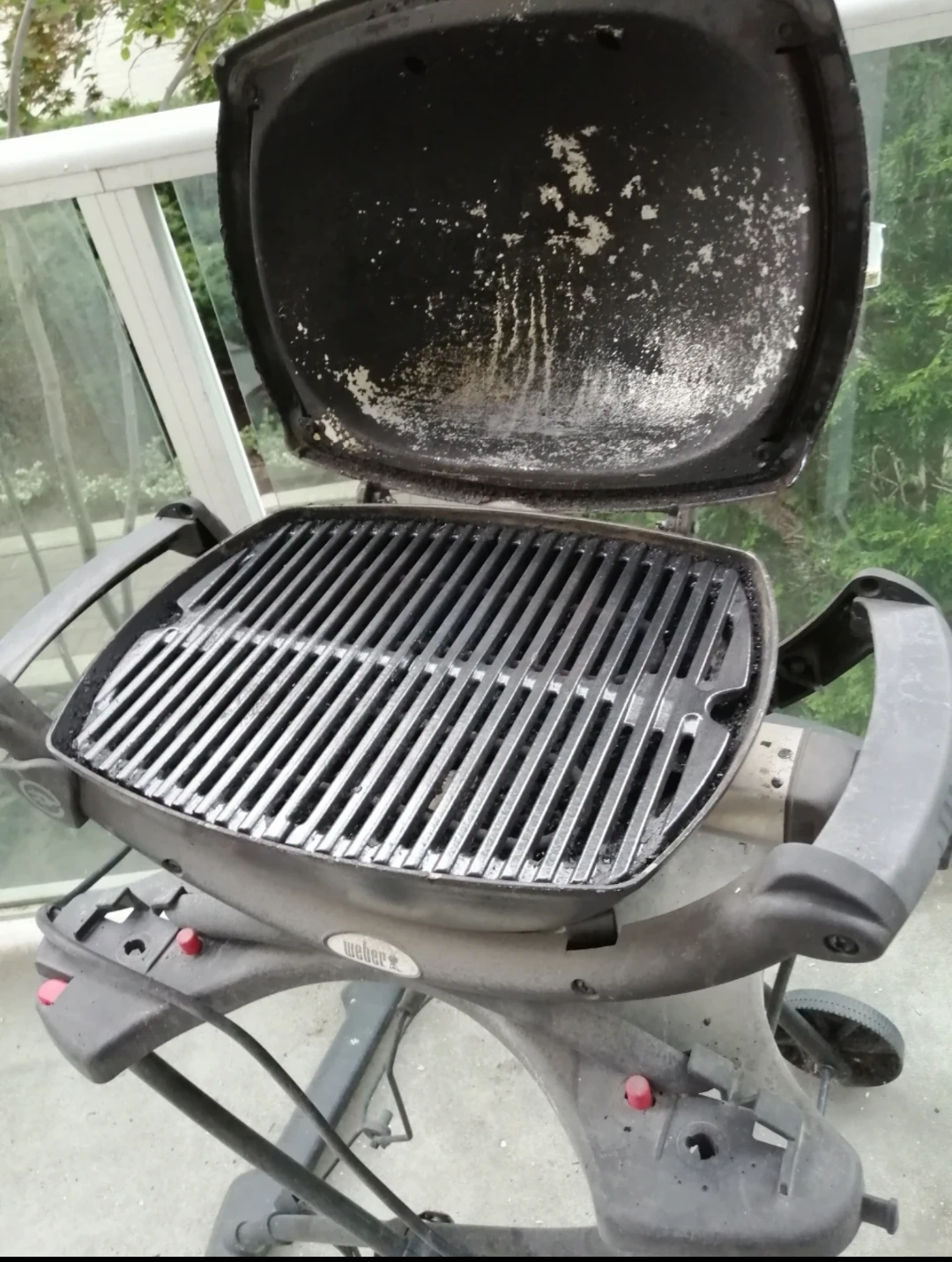 Portable Electric BBQ. Great for balconies and small spaces. Shows significant wear and tear. Needs cleaning. Includes stand and wheels.
