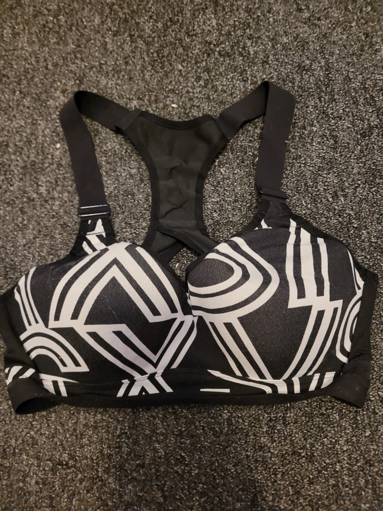 Victoria's Secret sports bra. Black and white geometric pattern. Racerback style. Size 36C. **** Cash Only **** **** Pickup Only **** **** No E-transfers **** **** Serious Inquiries Only/ Serious Offers Only ****