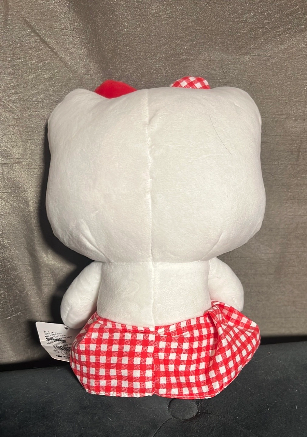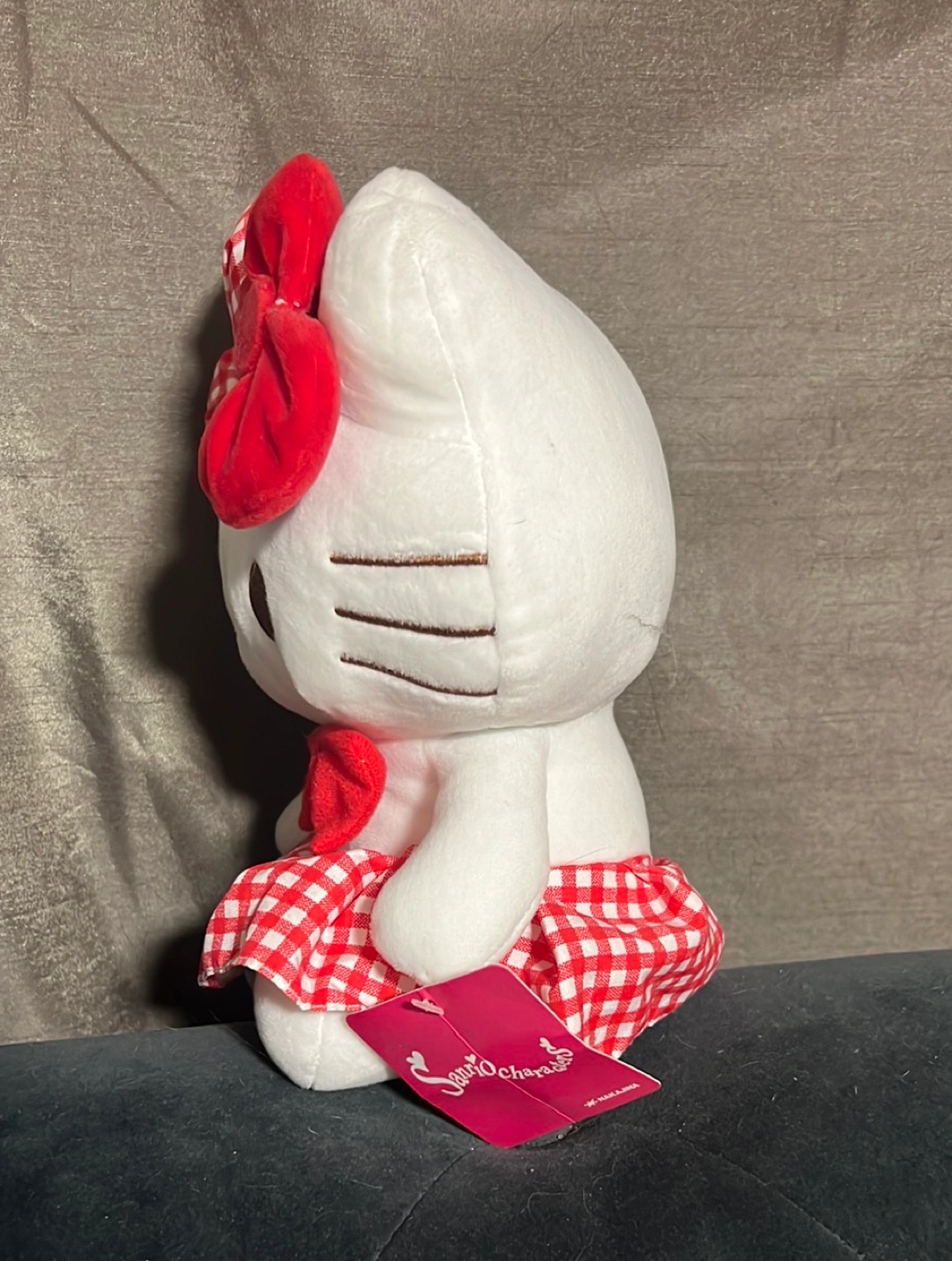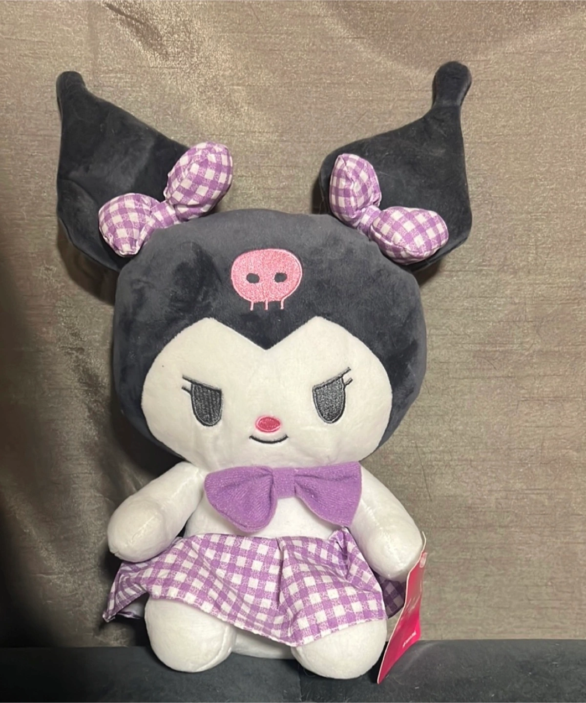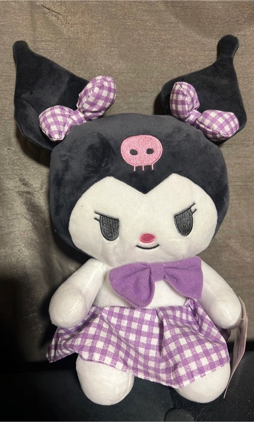 ❣️Soft and cuddly. ❣️ Perfect gift or collector's item. Cute Hello Kitty plush toy. Red and white gingham dress. Two bows, one red and one gingham. Kuromi plush toy. Purple and white gingham dress. Two purple and white gingham bows.