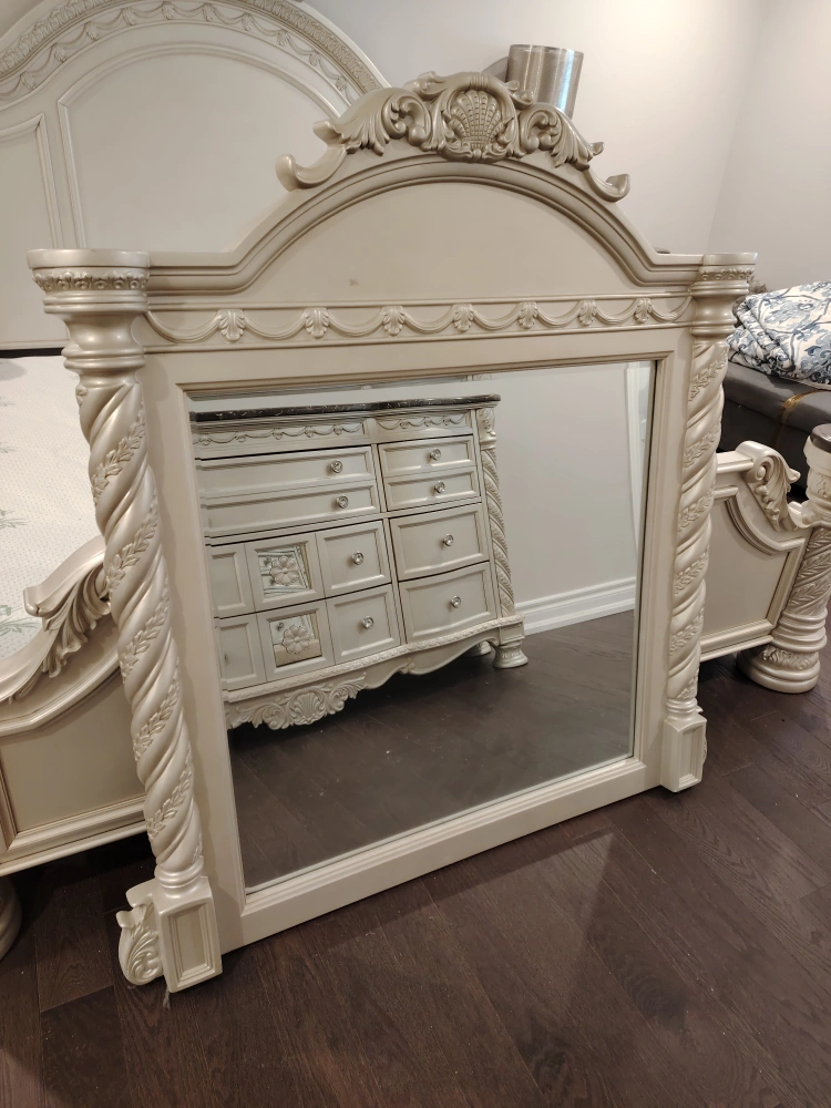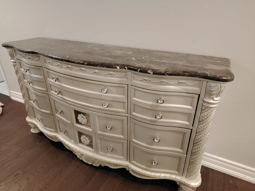 Beautiful dresser and mirror set. Features a marble top and ornate detailing. Twelve drawers provide ample storage. Mirror features a matching frame. Excellent for a bedroom.