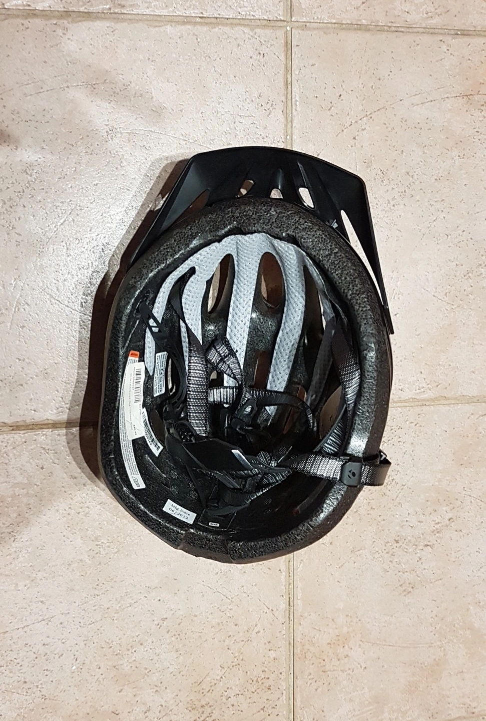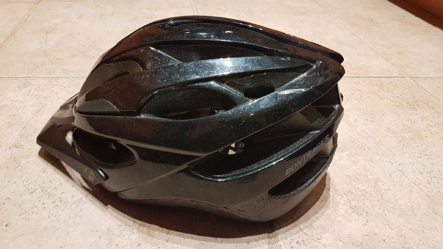 Adult sized cycling helmet. Black colour. Features adjustable straps and visor. Pre-owned. adult size- 55-61cm. 330gms