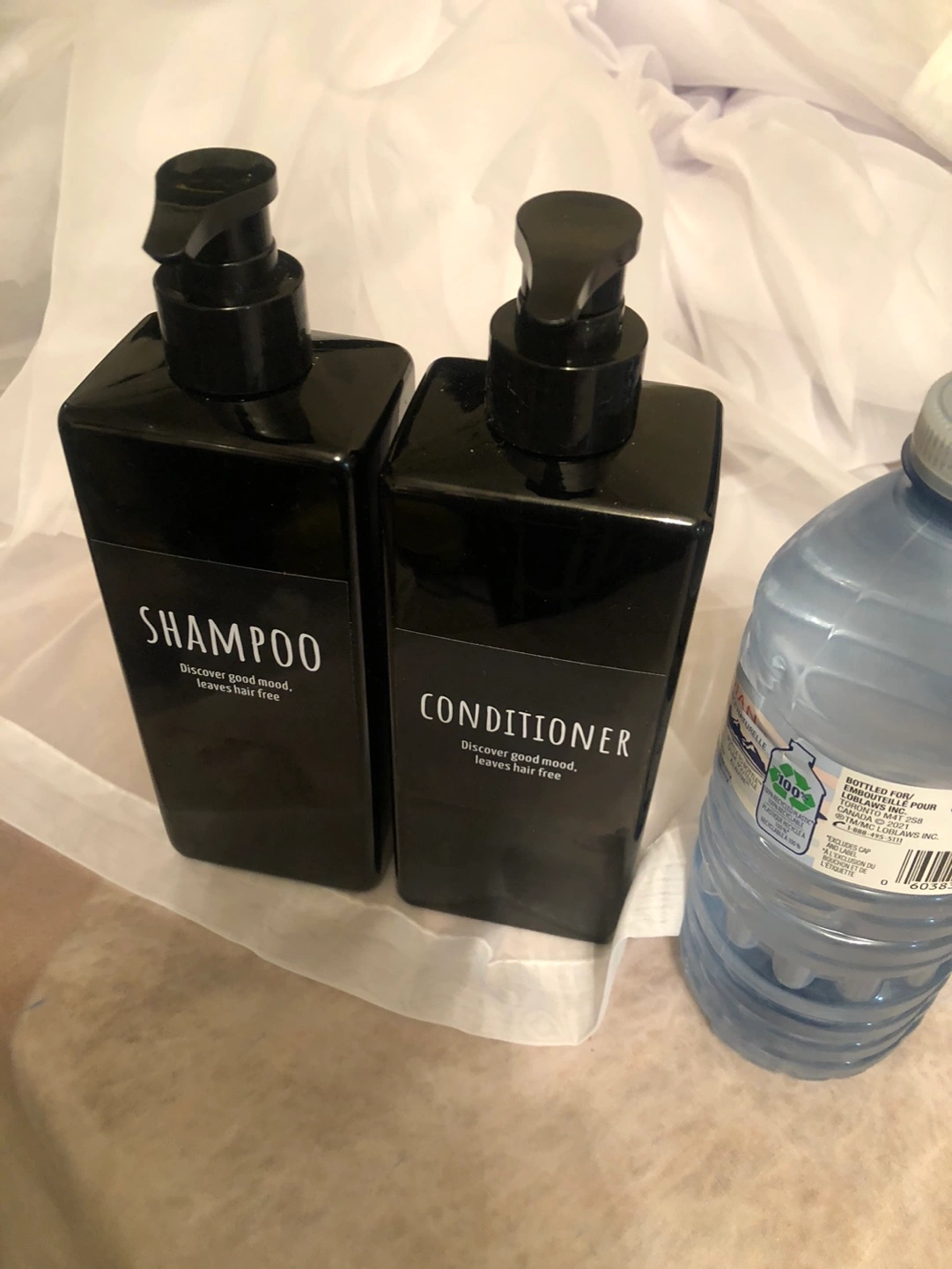 Black pump bottles. Shampoo and conditioner. Discover good mood, leaves hair free.