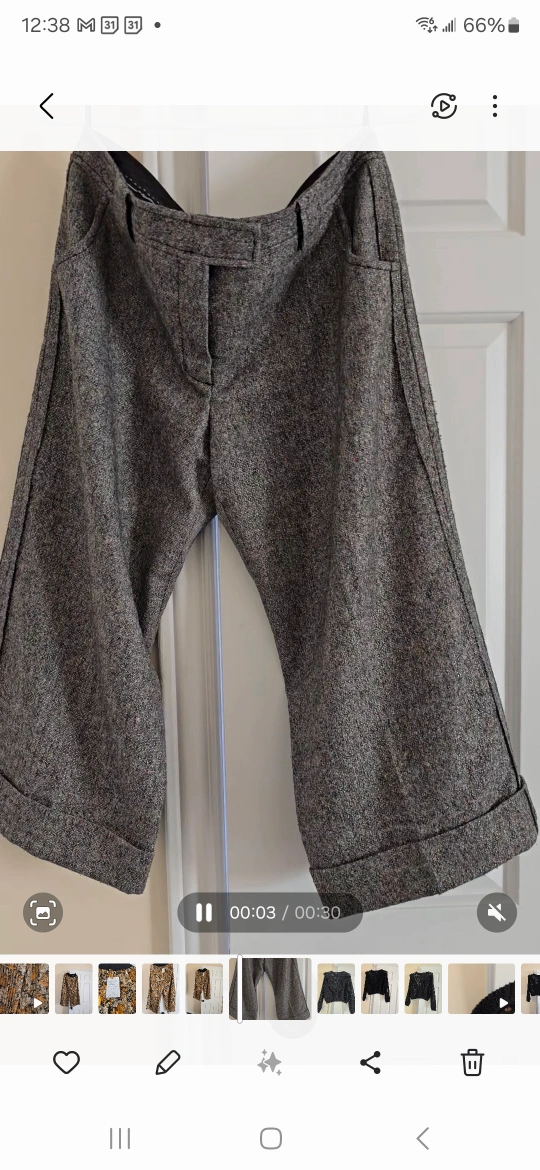 Grey wool blend culottes. Mid-length, loose fit. Rolled cuffs.
