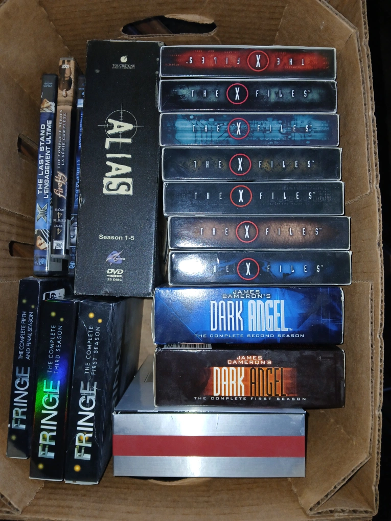 Large collection of DVD box sets. Includes complete seasons of The X-Files, Dark Angel, Alias, and Fringe seasons 1, 3 and 5. season 1 on Star Trek NG, Firefly, Underworld and Xmen: The last stand. Great for fans of Sci-Fi and drama.