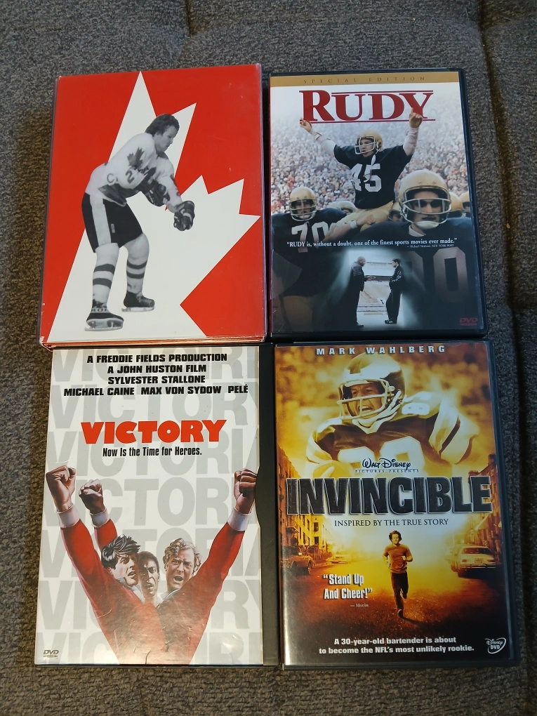 Collection of four sports DVDs. Includes Rudy, Victory, and Invincible. Great condition.
