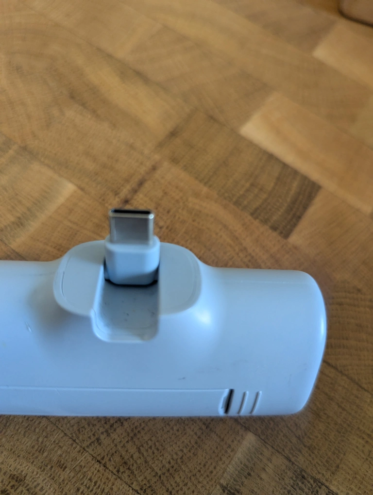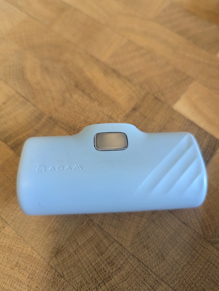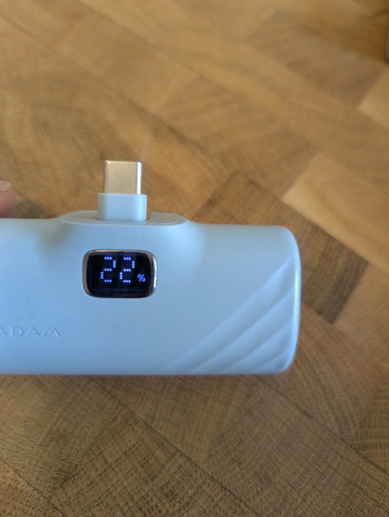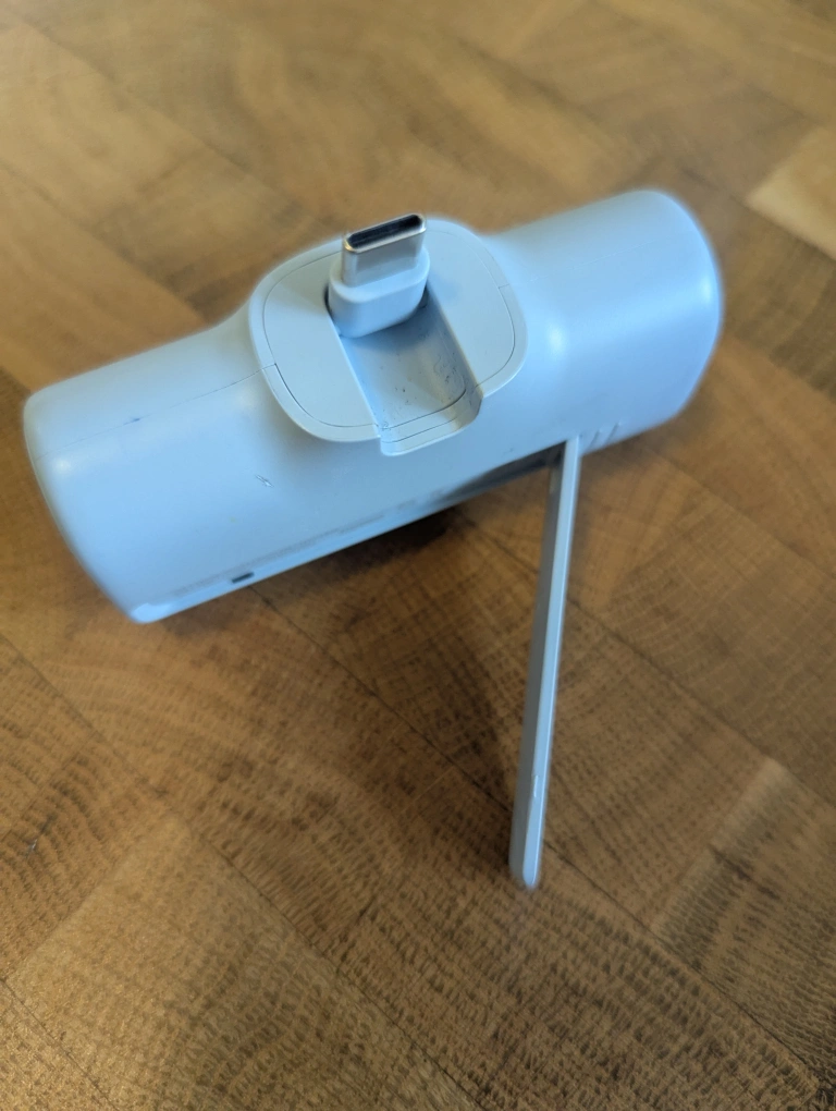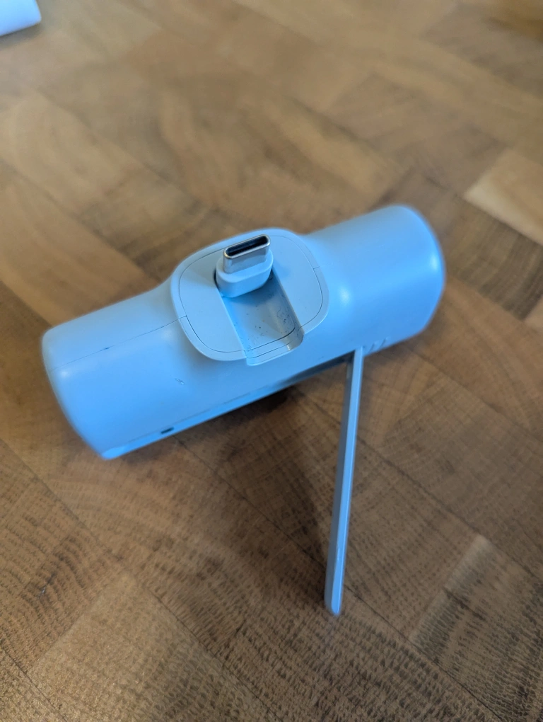 Light blue portable charger. USB-C input. Fold-out stand. Battery percentage display. Compact and convenient.