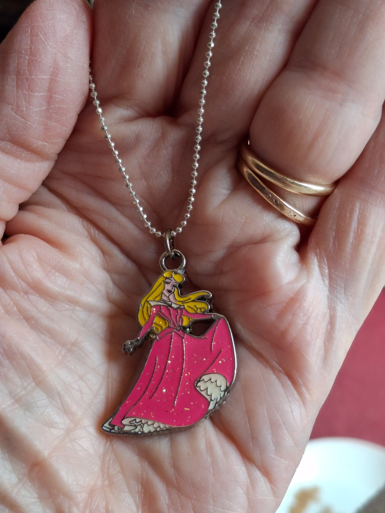 Silver chain necklace. Pendant features Sleeping Beauty in a pink dress. Sparkly accents.