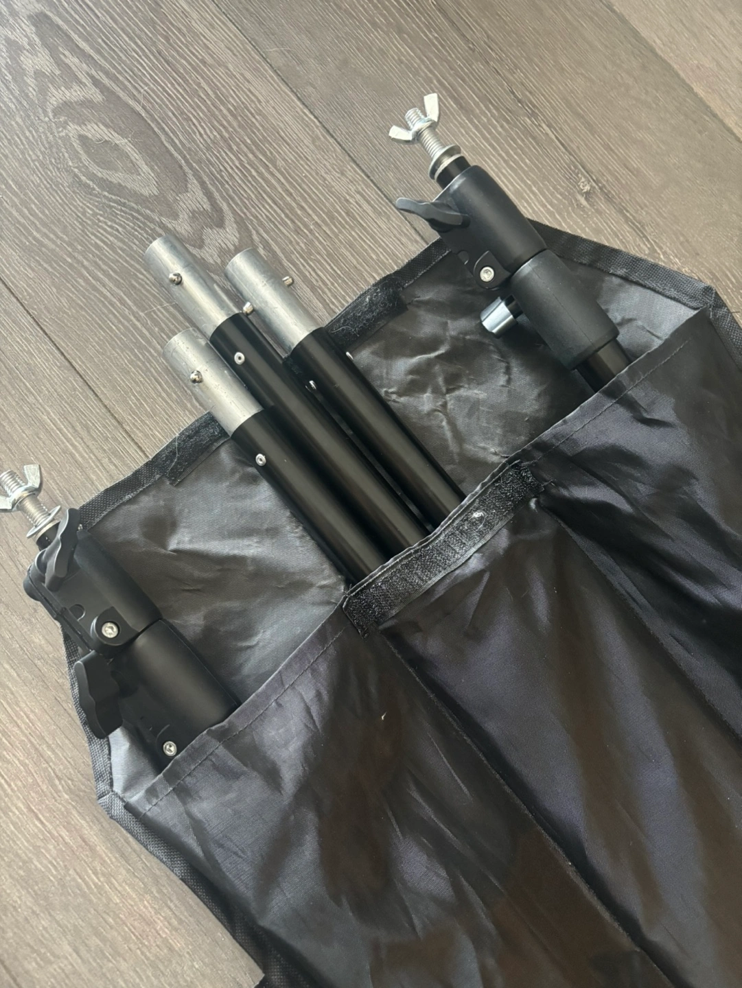 Portable backdrop stand. Includes carrying bag. Three-section poles. Great for photography or videography.