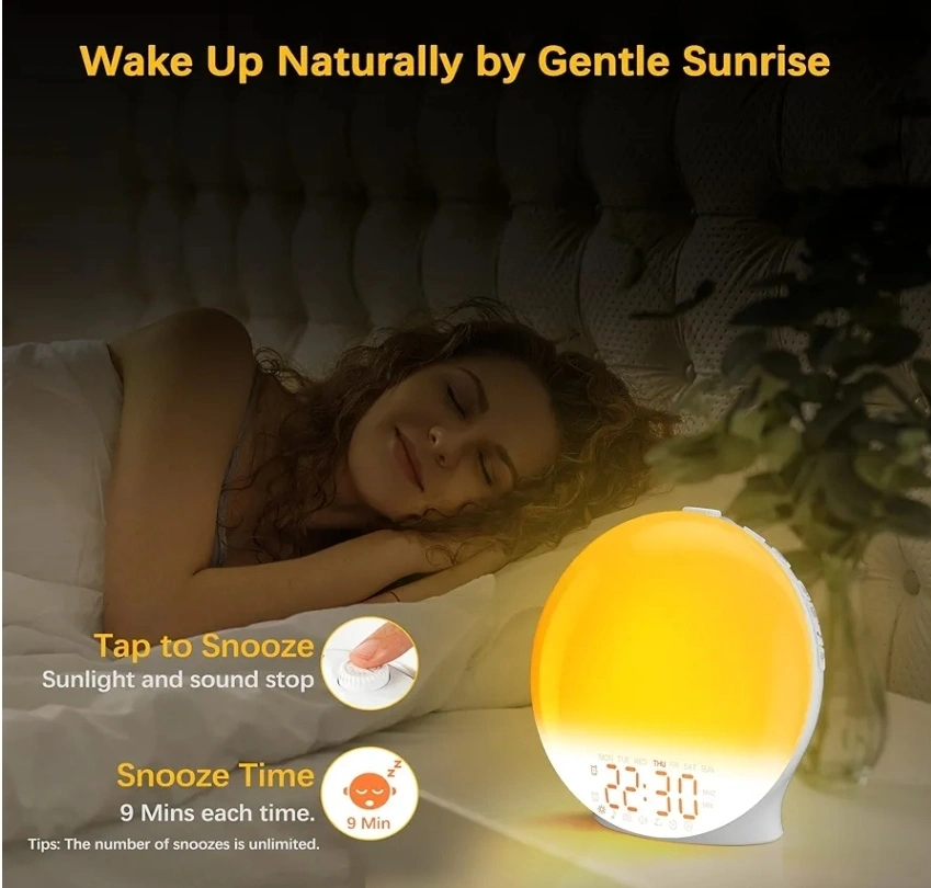 BNIB Brand New In Box Sunrise / sunset stimulation sleep light Lights change over time mimicking the sun Alarm clock snooze function Wake up from 8 natural sounds or FM radio Multicolor light Digital time display ***Please Check Out My Other Ads