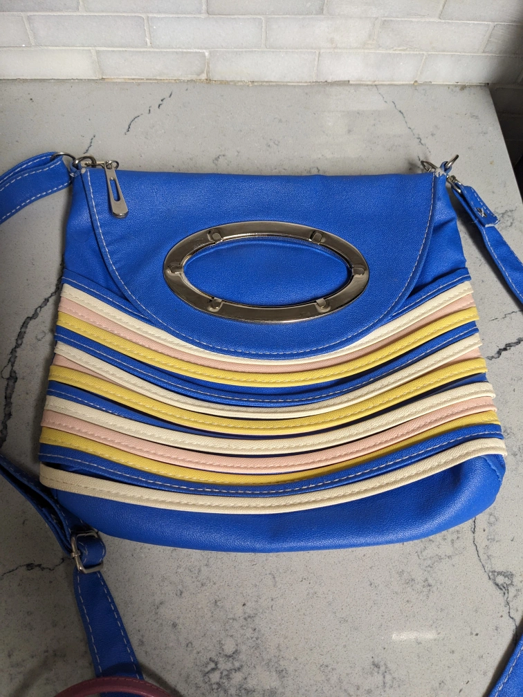 Stylish blue purse. Features a unique oval metal handle and multicoloured pastel striped detailing. Strap can be removed and used as a hand bag.
