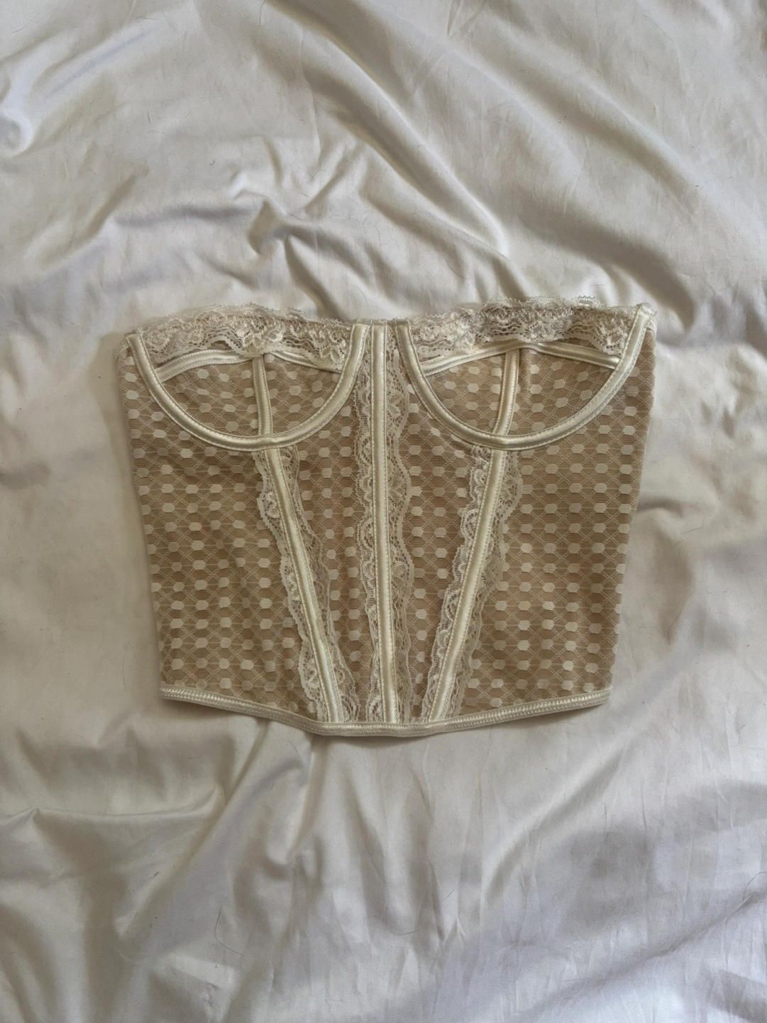 Beautiful cream corset top. Features delicate lace detailing and a satin back. Boning throughout. Strapless design. Unique and stylish.