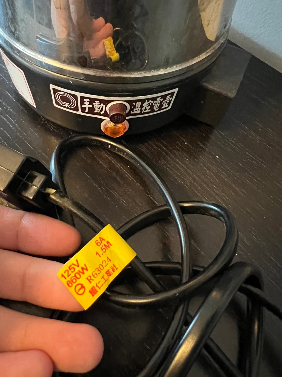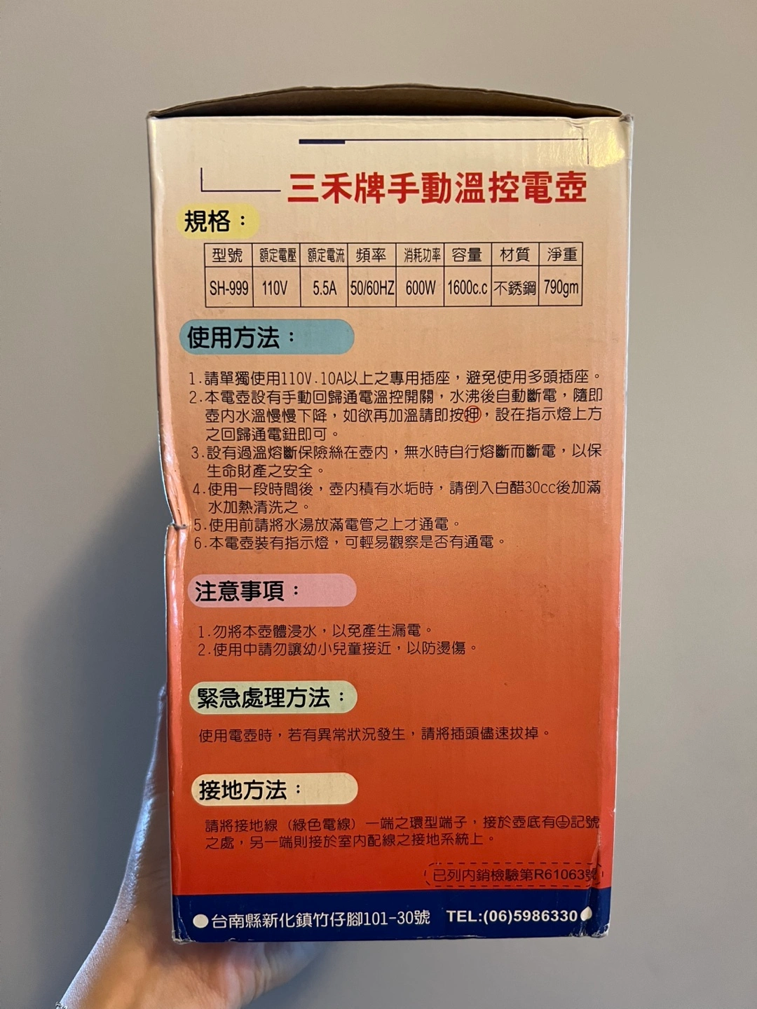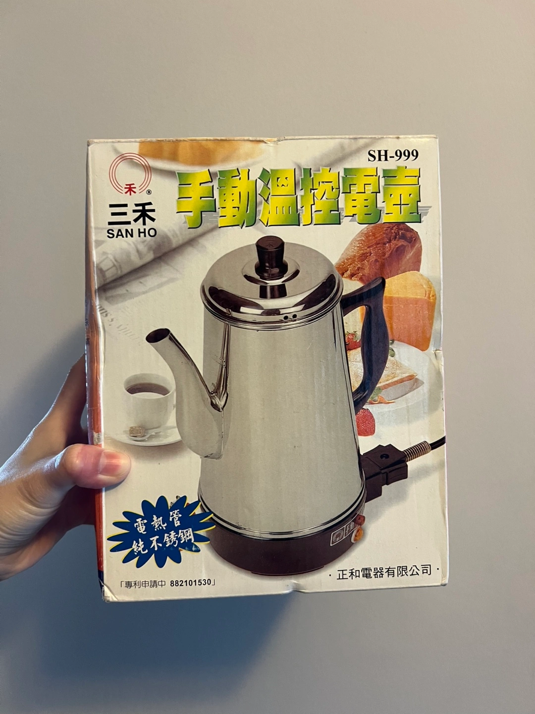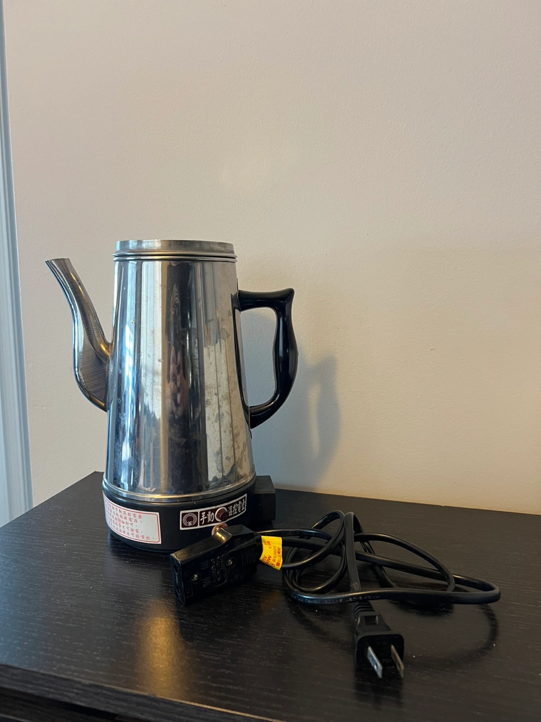 Manual control electric kettle. Silver metallic finish. Black handle and base. Includes power cord. Model SH-999.