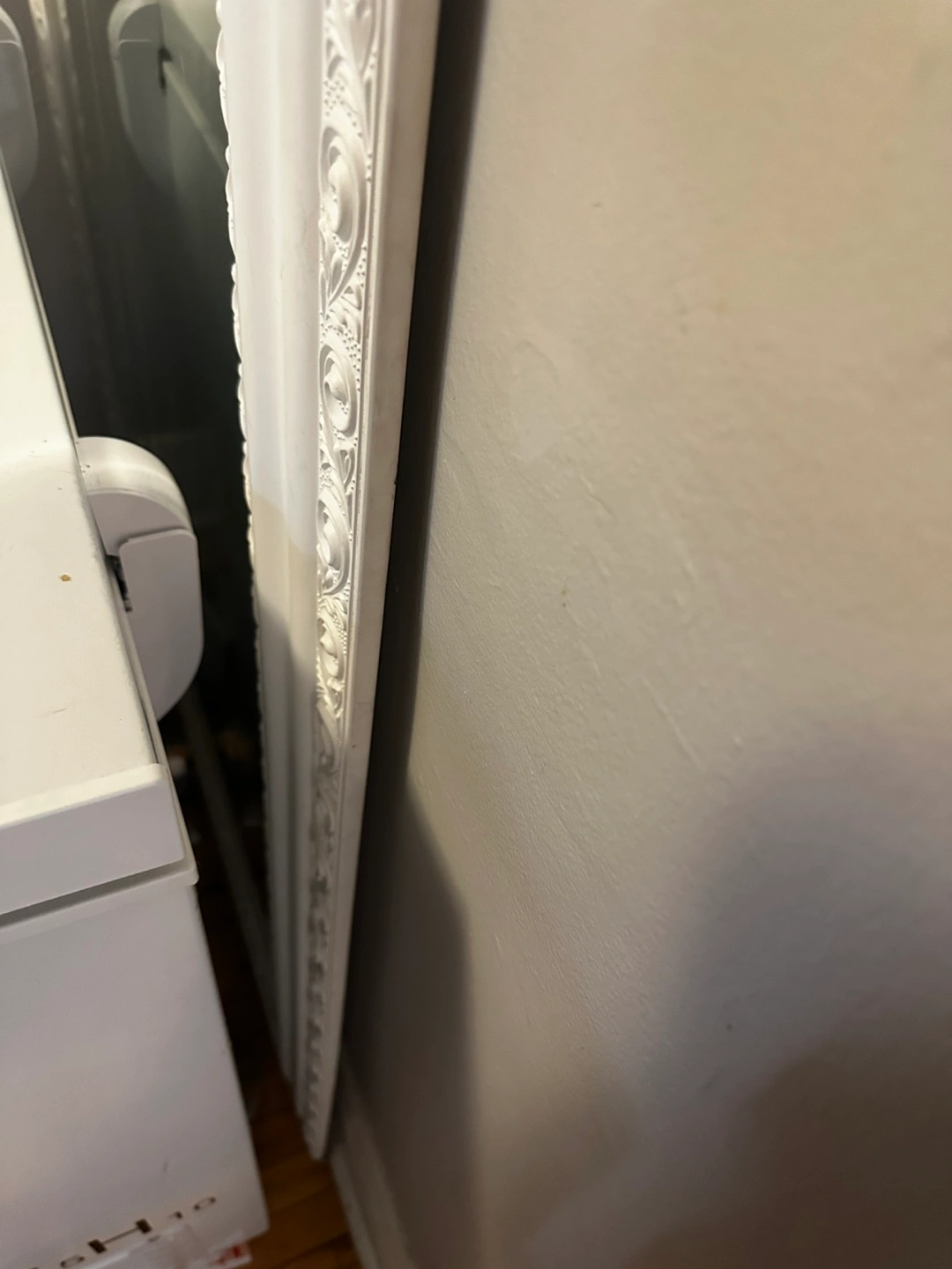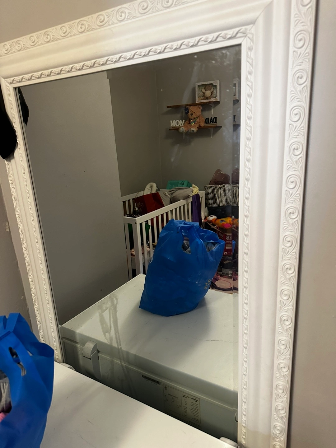 Large white framed mirror. Intricate detailing on the frame. Perfect for a bedroom or entryway or bedroom.