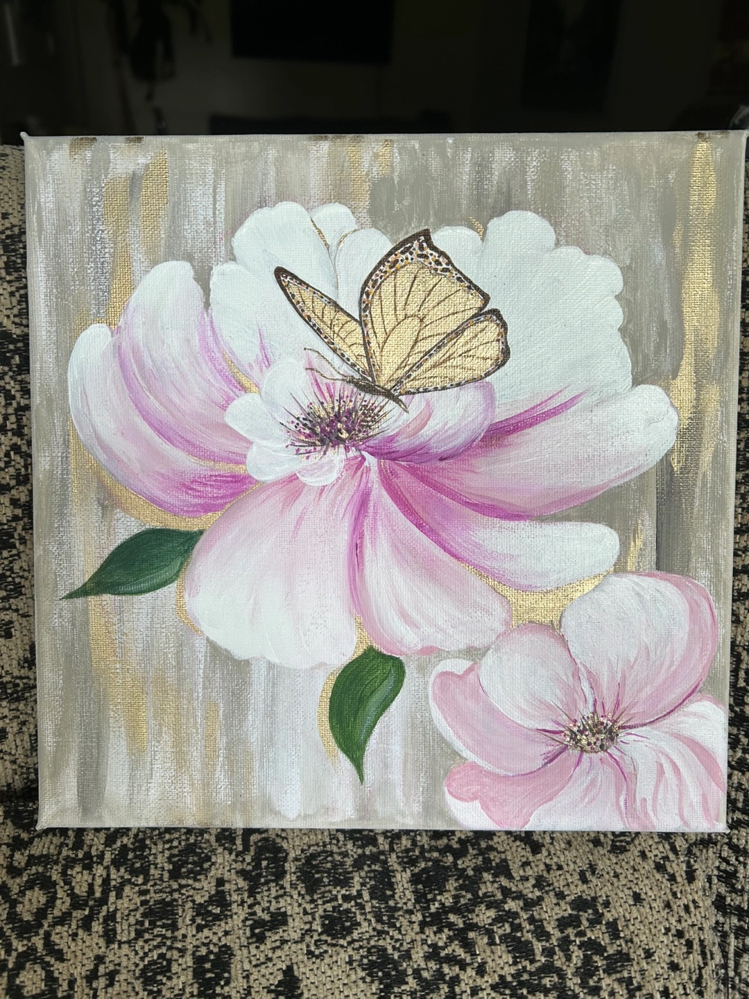 Hand-painted canvas art. Features pink flowers and a gold butterfly. Gold accents on the background. Small, square-shaped canvas. Dimensions: 10"*10"/25*25cm