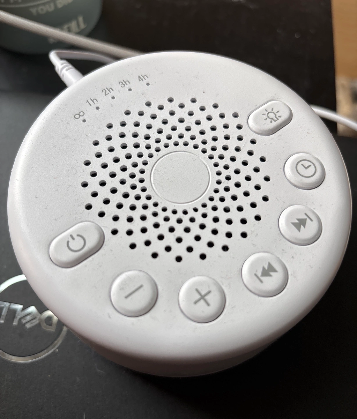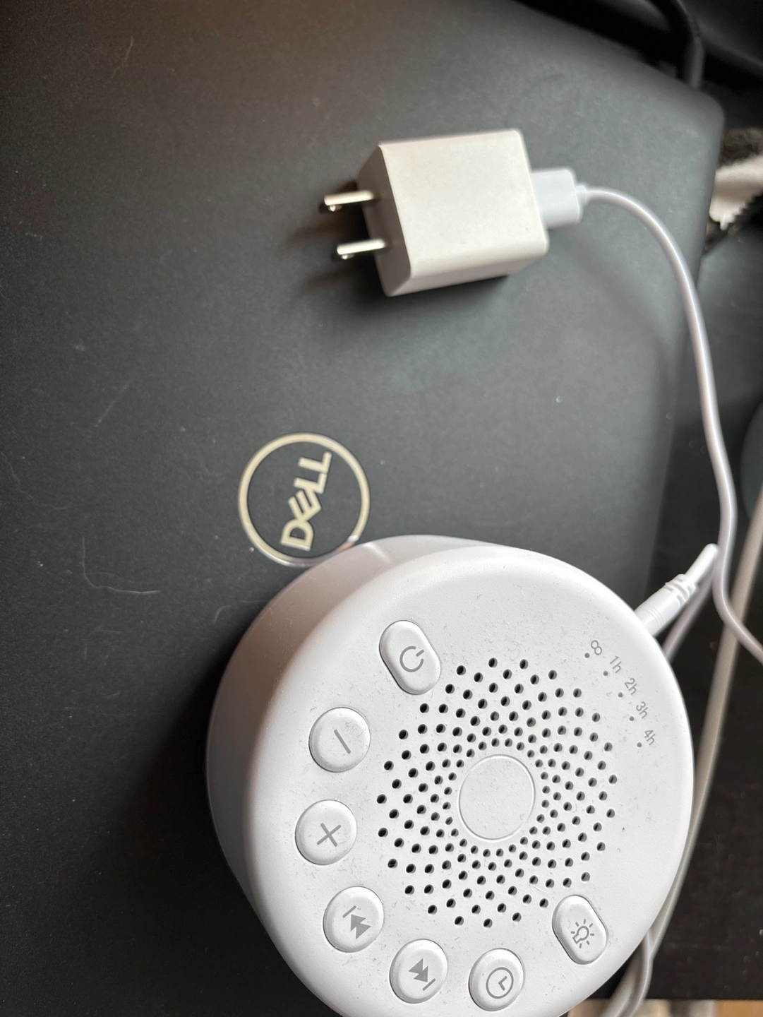 Portable sound machine. Multiple sound options and timer settings. Includes power adapter. Lightly used.