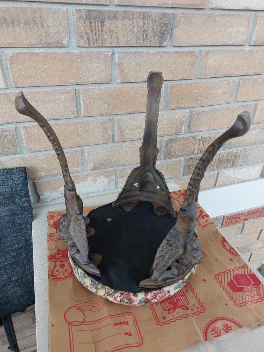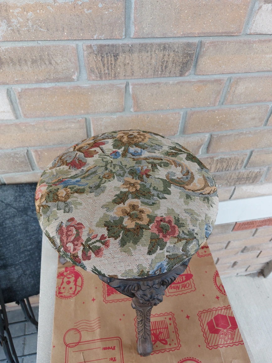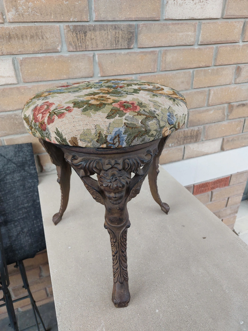 Vintage Cast Iron Footstool with Floral Tapestry Seat Ornate cast iron base. Floral tapestry seat. Three legs. Unique design. height 16 inches width 12.5 inches