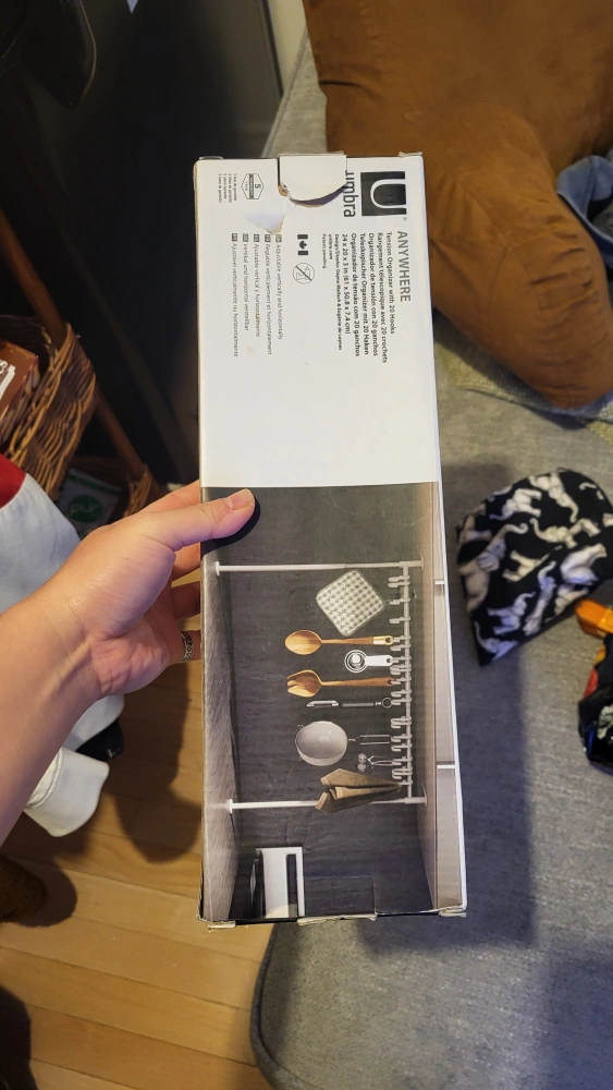 White kitchen organizer. Twenty hooks. Tension rod design. Great for utensils, towels, and more. New in box. MOVING AND NEED GONE ASAP. Meetup at Bloor and Yonge, St. James Community Centre (Sherbourne and Wellesley), surrounding areas, or Bayview Village Area.