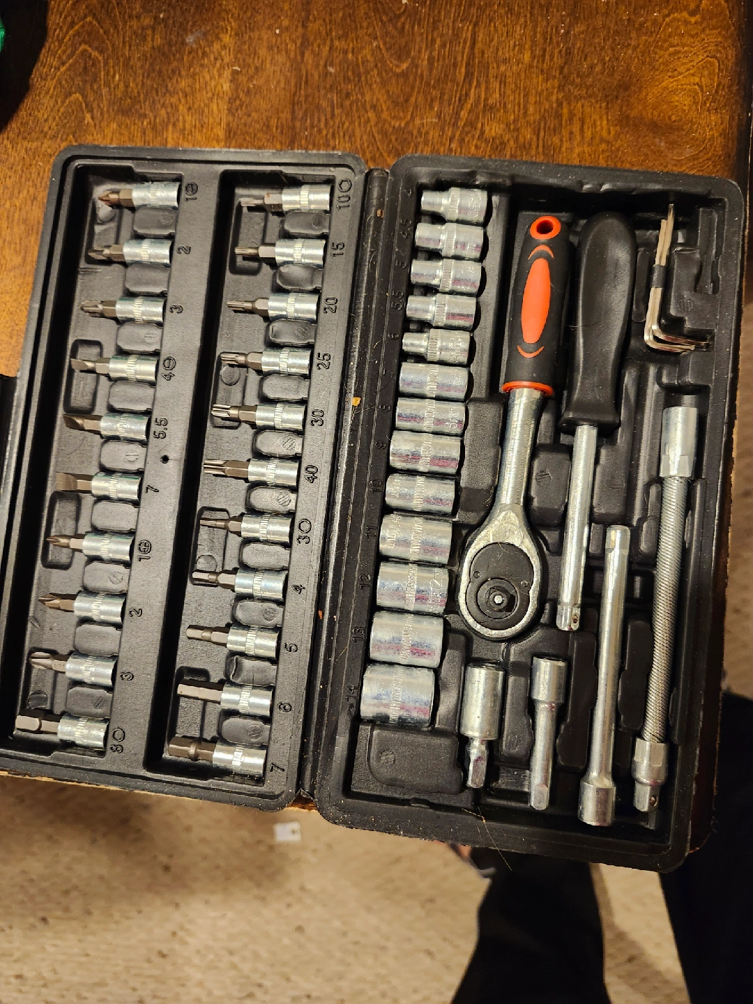 Selling a 46-piece socket wrench set in a black case. It includes a variety of sockets, screwdriver bits, and a ratchet wrench. Perfect for small repairs around the house or in the garage!