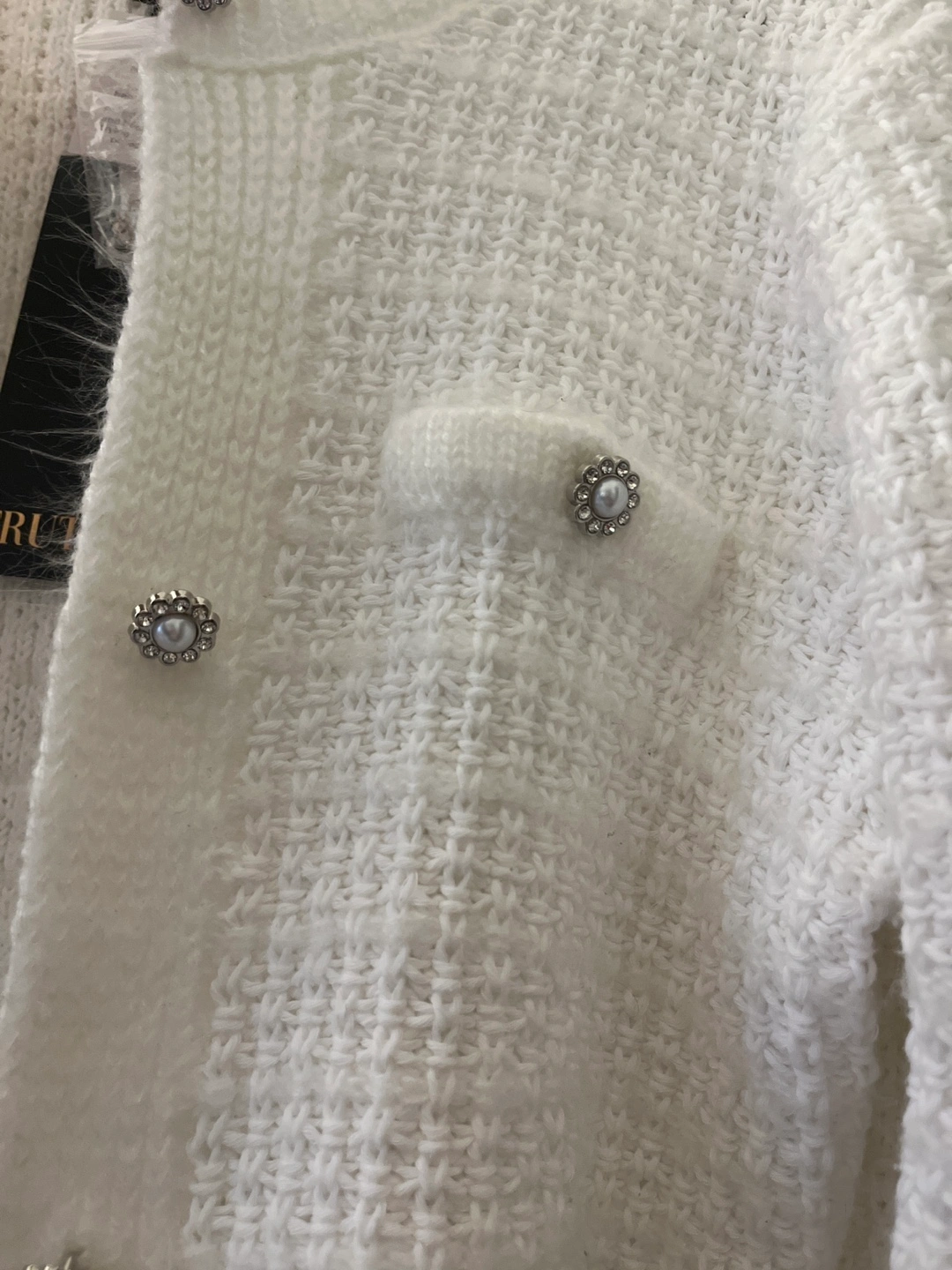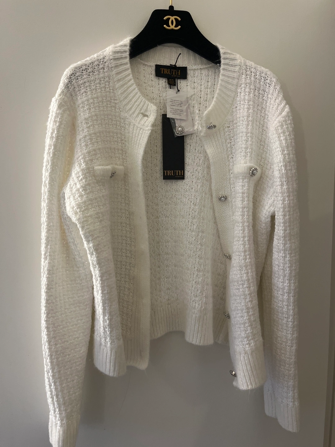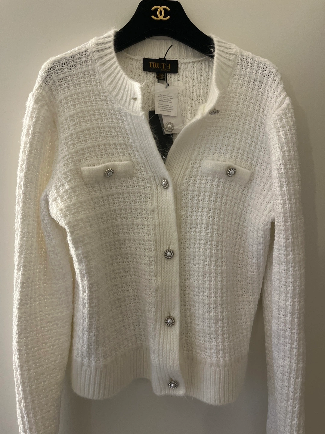 Beautiful white knit cardigan. Features pearl buttons and flap pockets. Long sleeves. New with tags. Fits like a SMALL