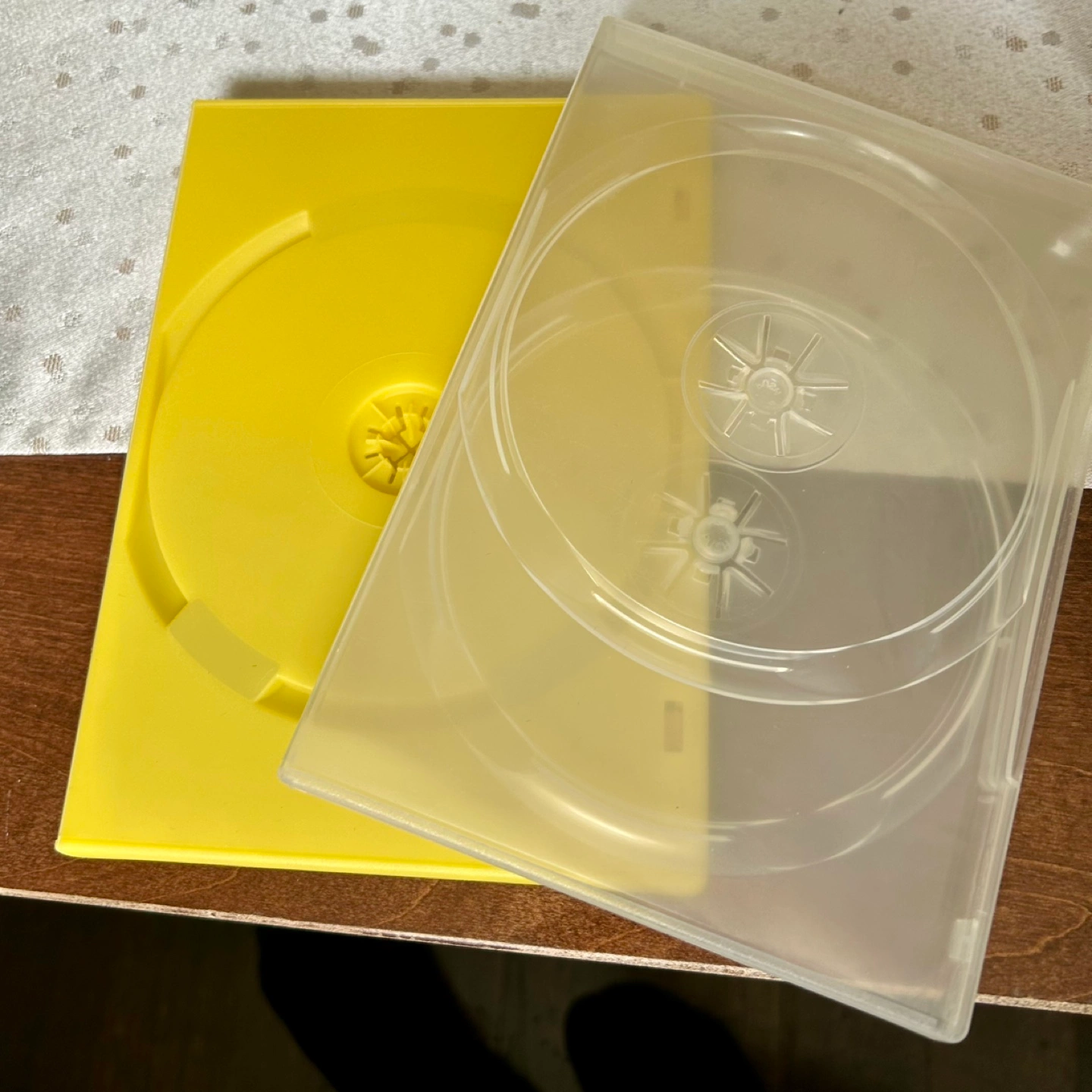 Various coloured plastic CD and DVD cases. Includes single and double cases. Also includes a red silicone stand for CDs and a metal tin.