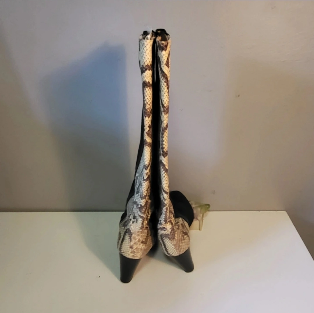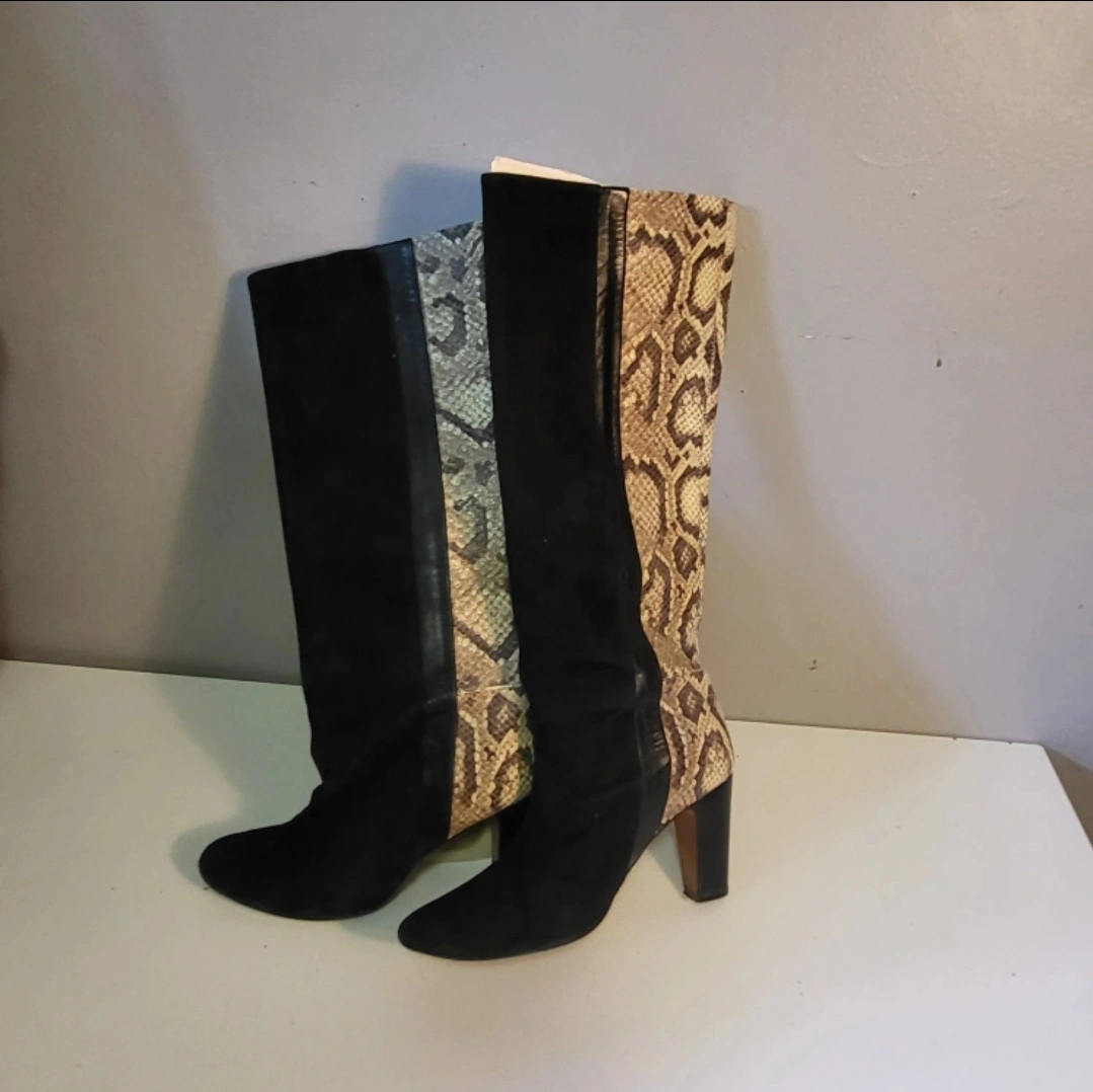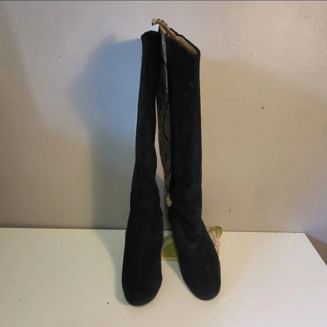 Black suede & Leather knee-high boots. Features a snakeskin print panel on the side. Block heel and pointed toe. Heel measures approx 3inches. A timeless addition to any wardrobe. Smoke free home Rossland and Stevenson north