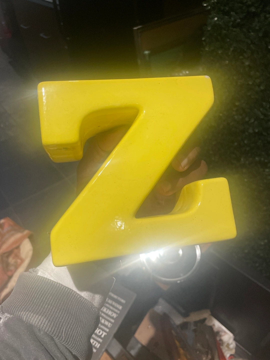 Large yellow ceramic letter Z. Perfect for home decor or shelving. Great statement piece.
