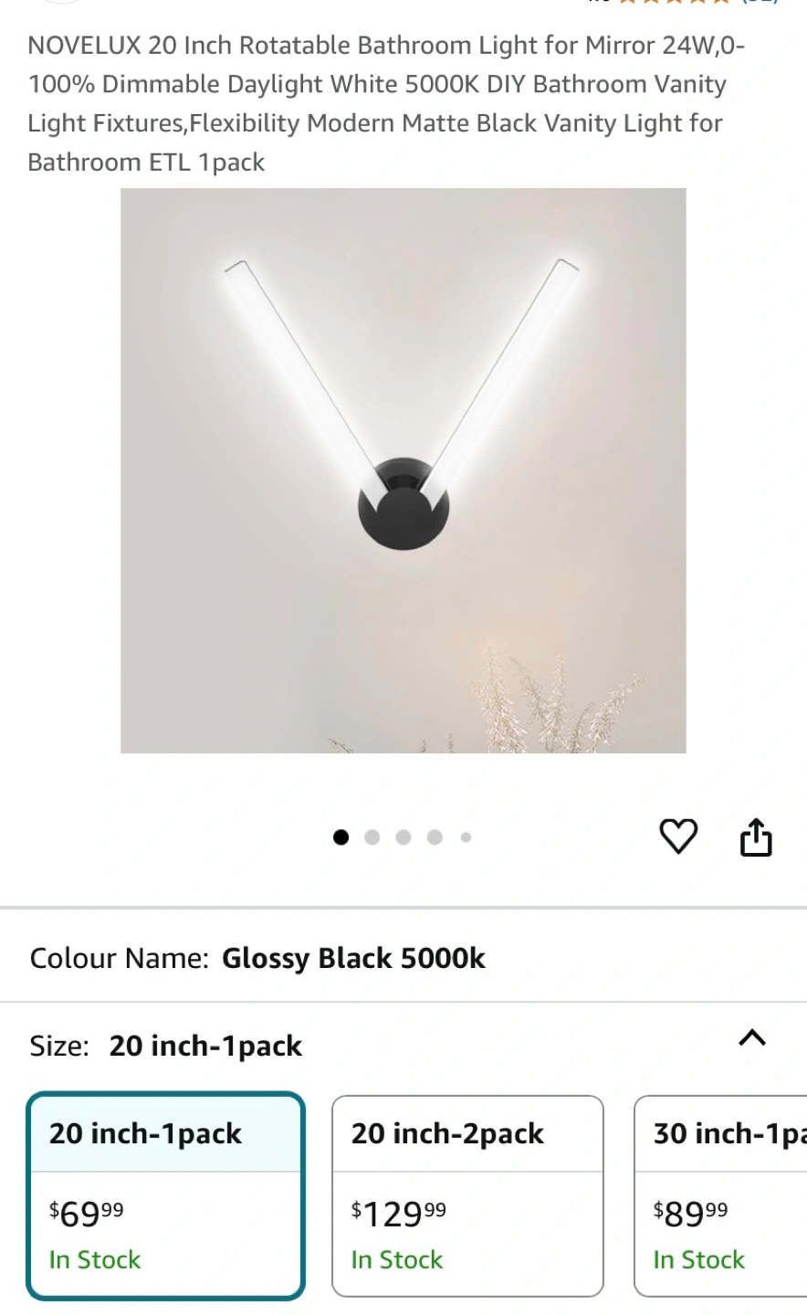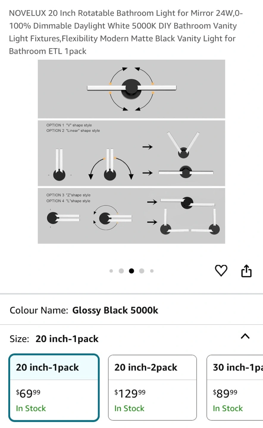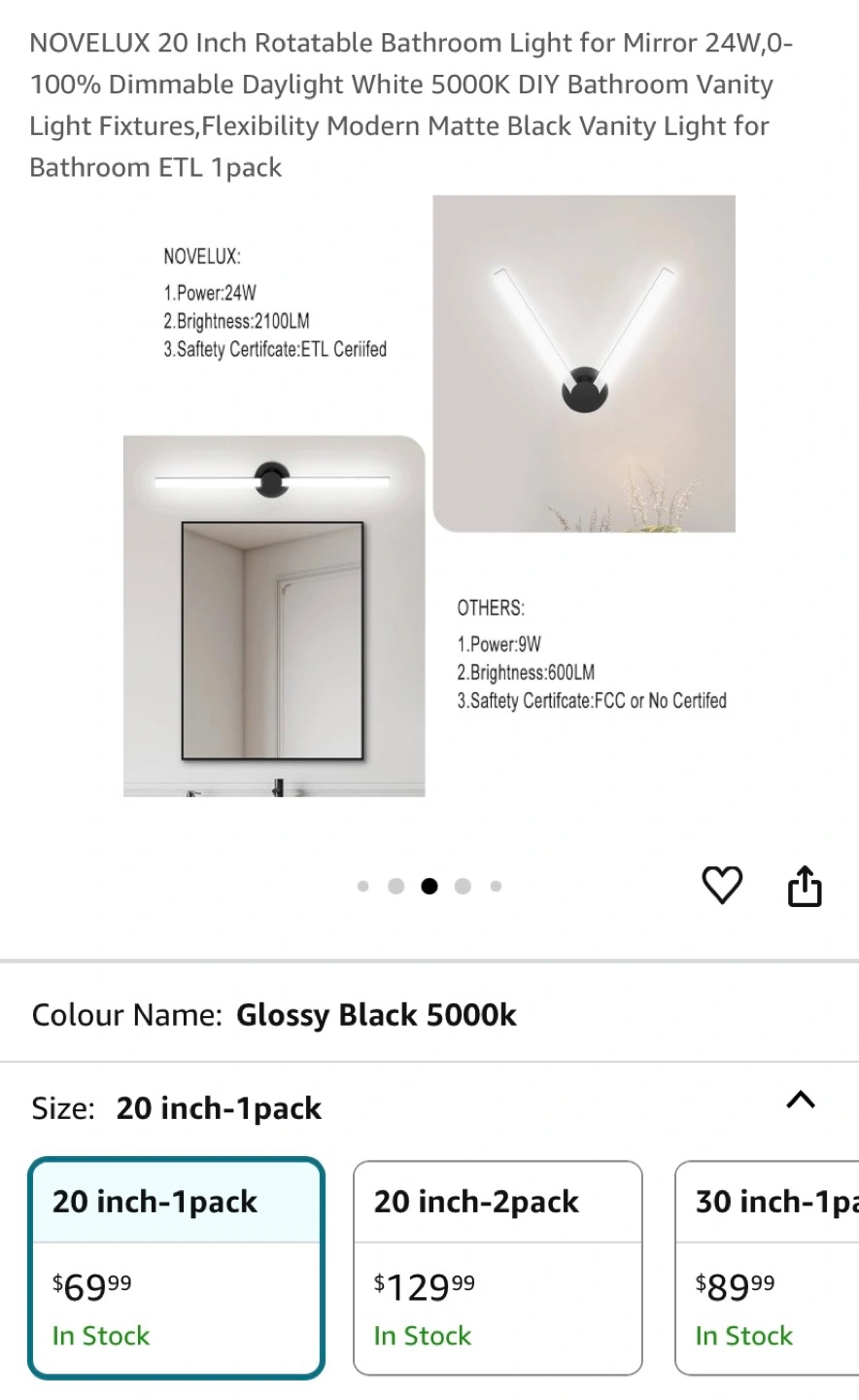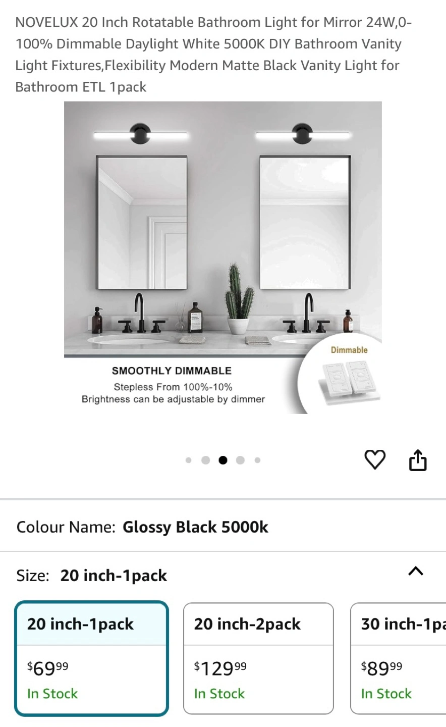 NOVELUX 20 Inch Rotatable Bathroom Light for Mirror 24W,0-100% Dimmable Daylight White 5000K DIY Bathroom Vanity Light Fixtures 1 pack for $45 2 packs for $80 Pick up Richmond Hill BRAND NEW IN BOX