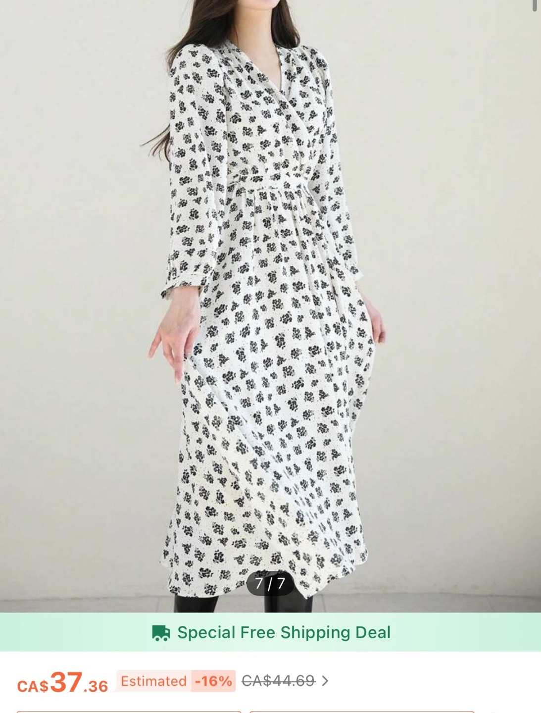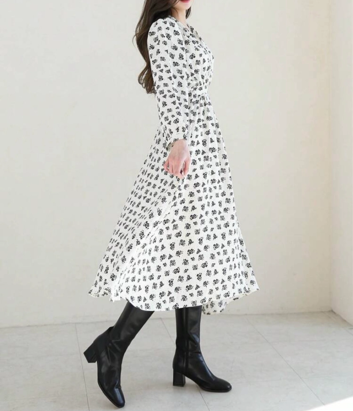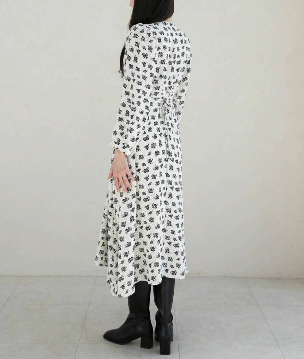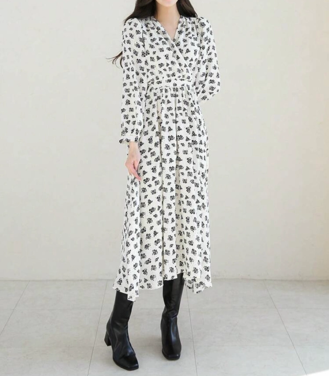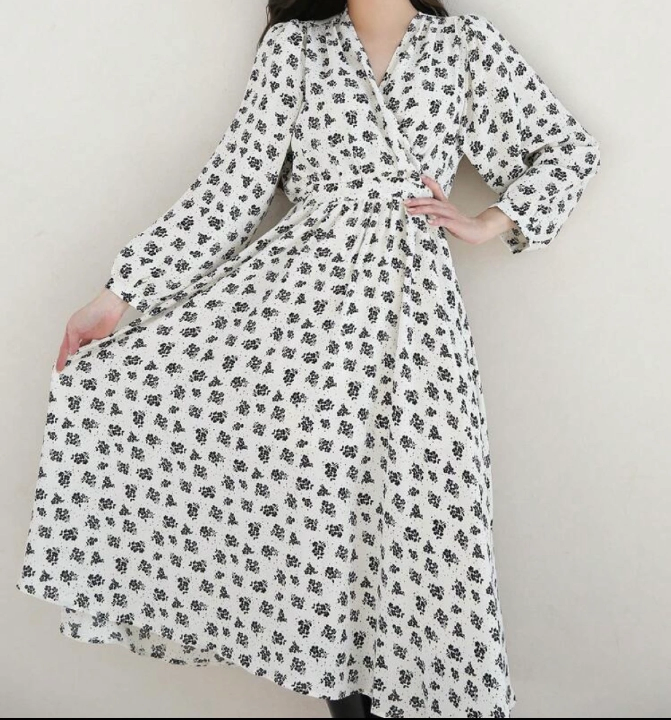 Long-sleeved midi dress. Features a V-neck, cinched waist, and all-over black floral print on a cream background. Flowy A-line skirt.