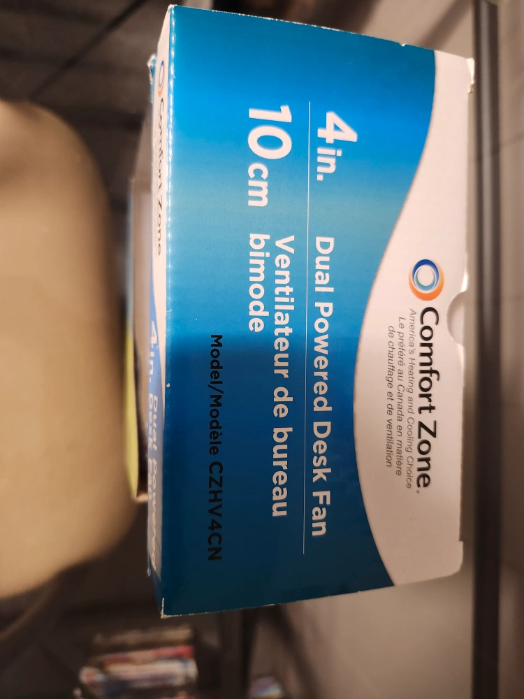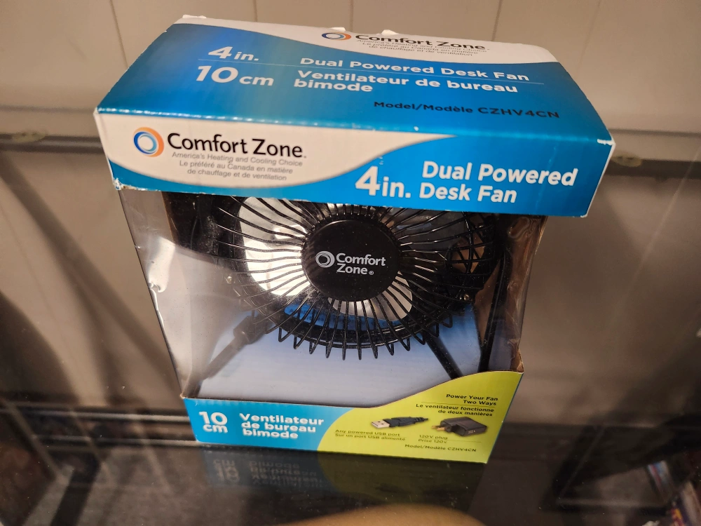 New in box. 4 inch dual powered desk fan. Model CZHV4CN. Powered by USB or plug.