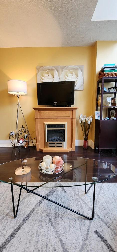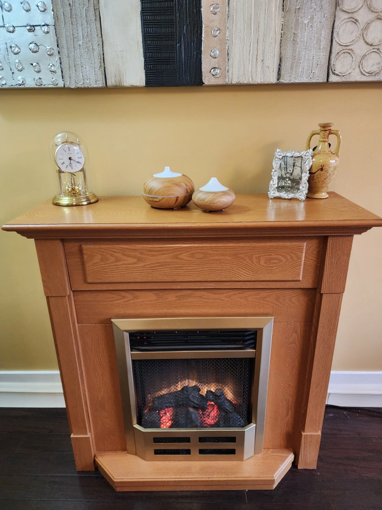 Electric fireplace with built-in mantle. Great for creating ambiance in smaller spaces. Can be used as TV stand. Message me if you'd like to see video of it in action! NOTE: Heating element not working. Fireplace is great for mood/ambiance, but not for heating a room unless you replace the heat element. Price reflects this. Originally purchased for.$700. Need gone. Make an offer!