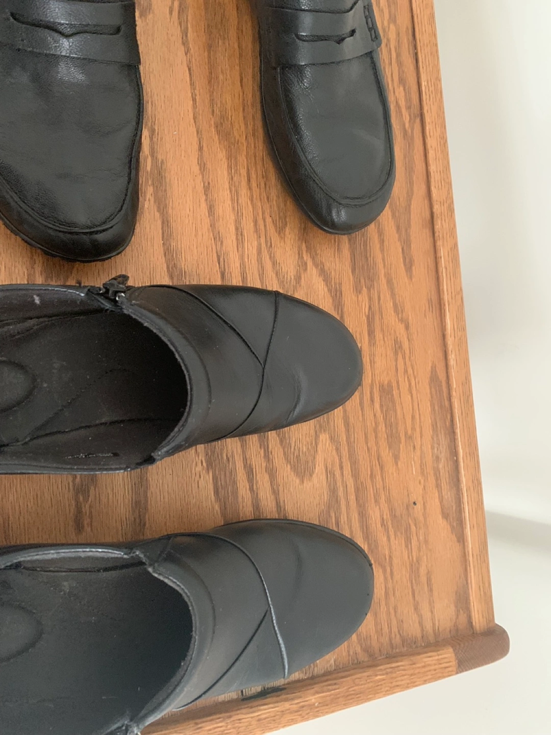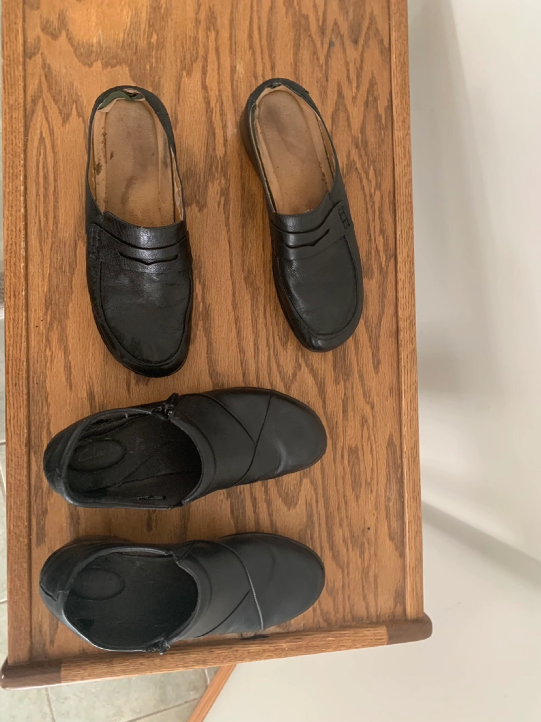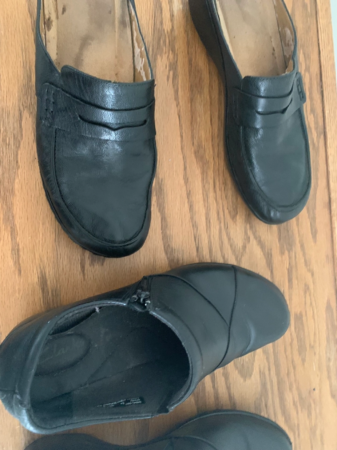 Three pairs of women's shoes. Two pairs of black leather loafers, one pair of black leather ankle boots. All shoes appear well-worn.