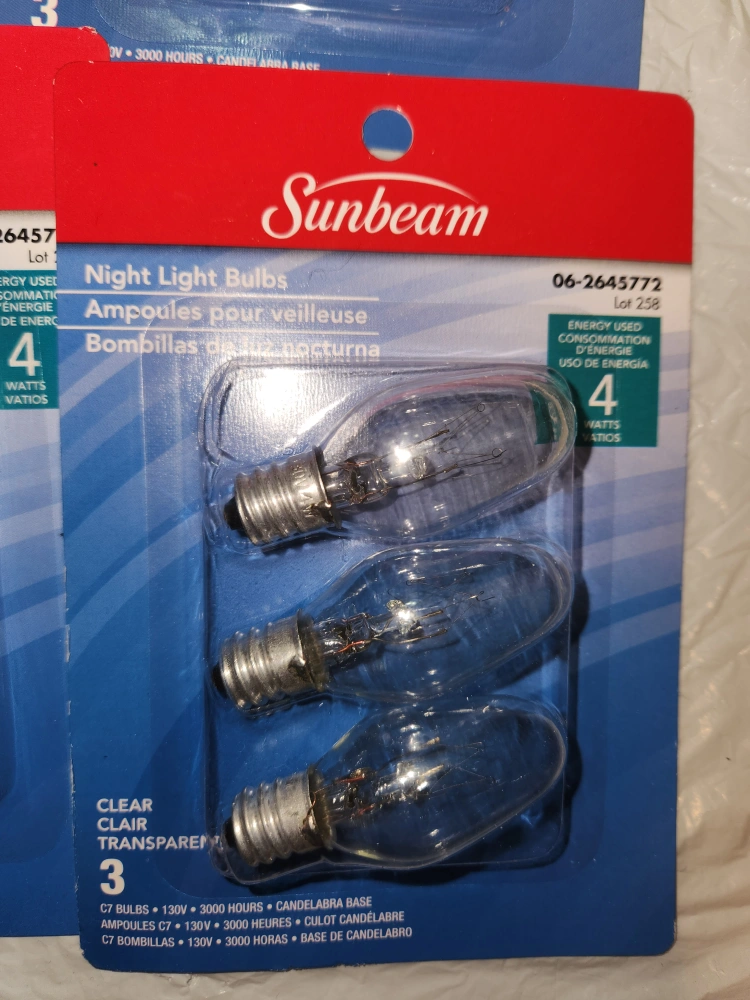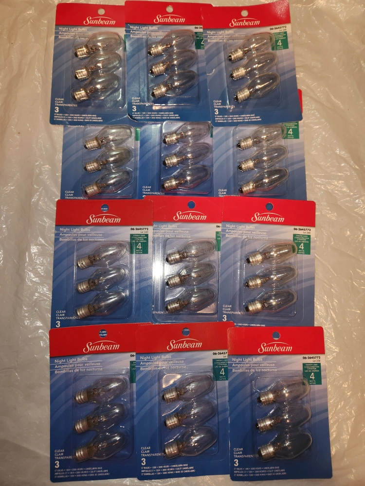 Brand new!! $10 total for all 12 packs! Cash Only. Pickup only. Twelve 4-watt night light bulbs. 3000 hours. Perfect for bedrooms, bathrooms, hallways.