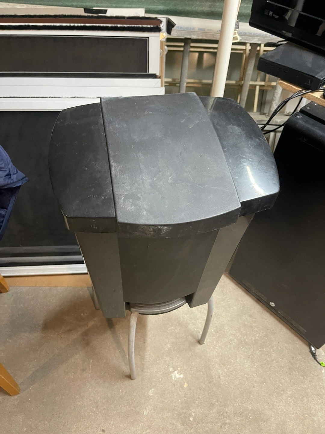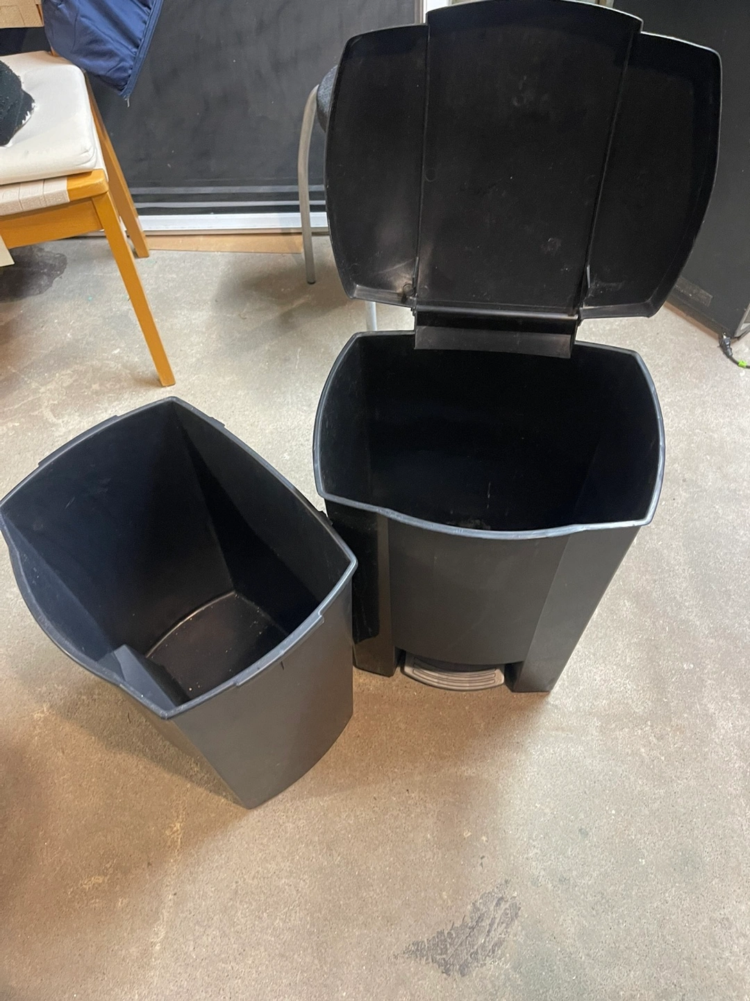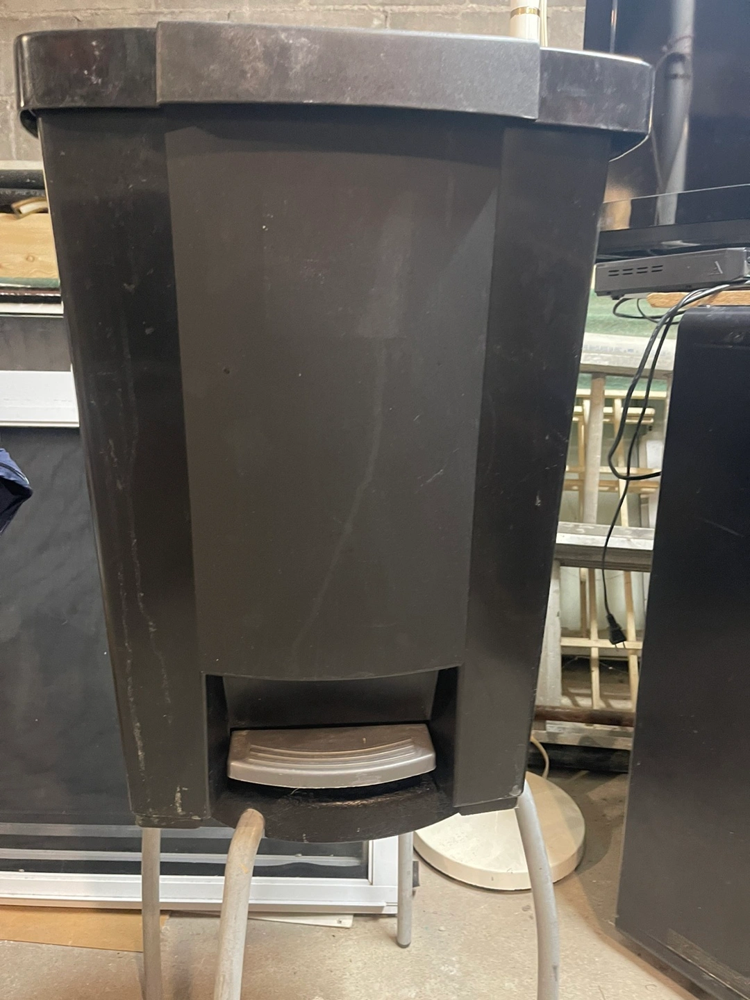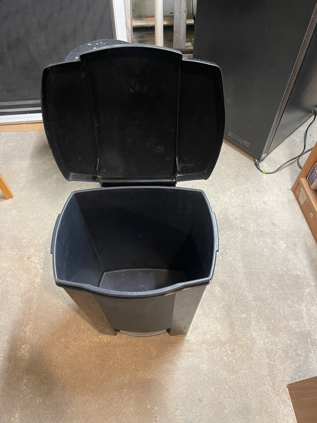 Large capacity black plastic trash can. Features a step-on mechanism and removable inner bucket. Good for home or office use. Shows some minor wear.