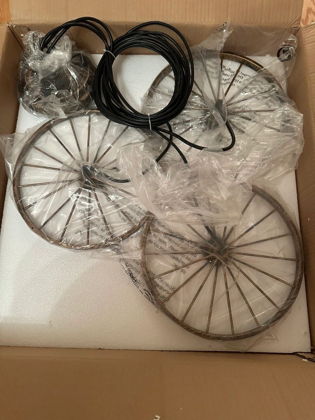 Brand new, still in box. Three-light wagon wheel design. Dark bronze finish. Includes all hardware and wiring. Unique farmhouse style.