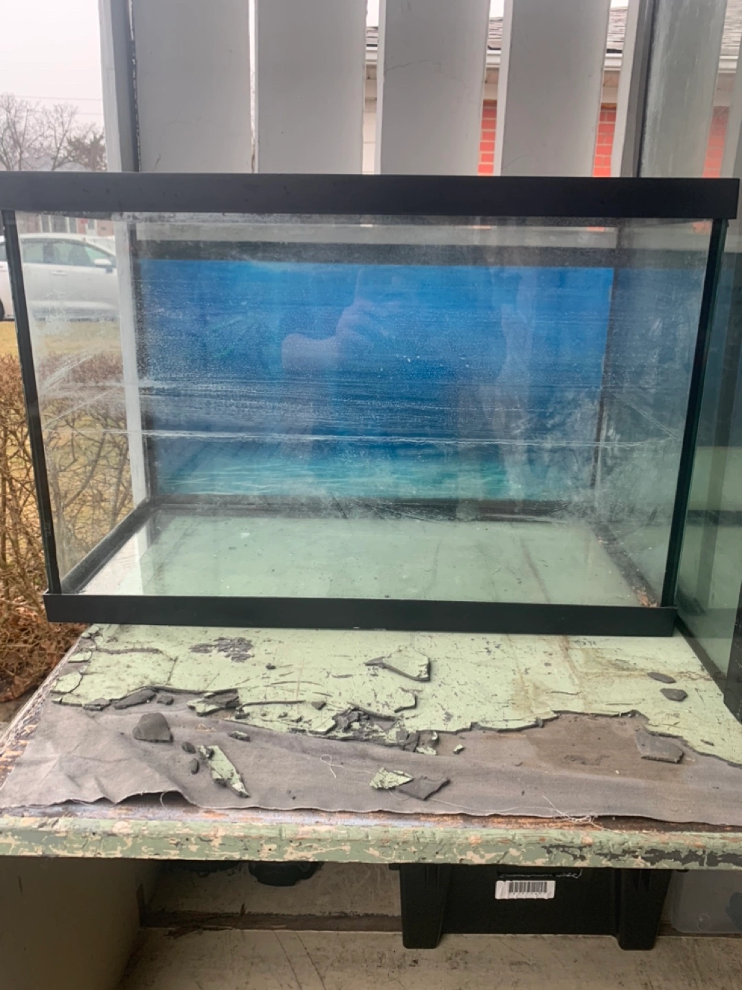 Empty glass aquarium tank. Black frame. Blue background. H-16inches, L-24 inches, W-12 inches. 20 gallons.