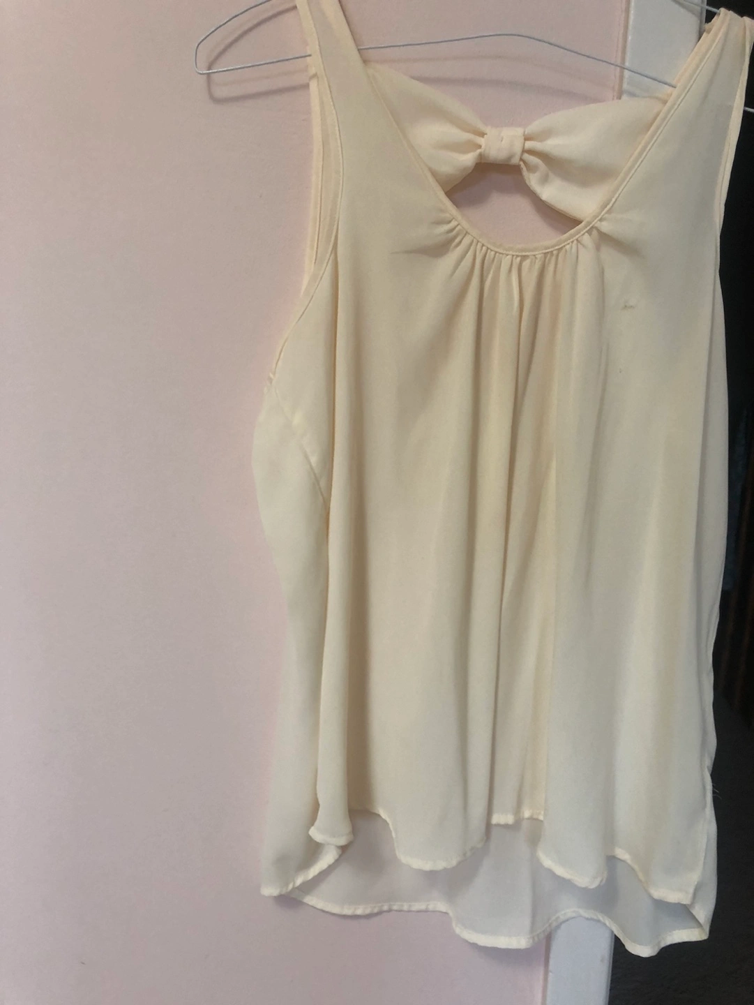 Flowy sleeveless top. Features a keyhole back with a bow accent. Cream coloured. Lightweight material.