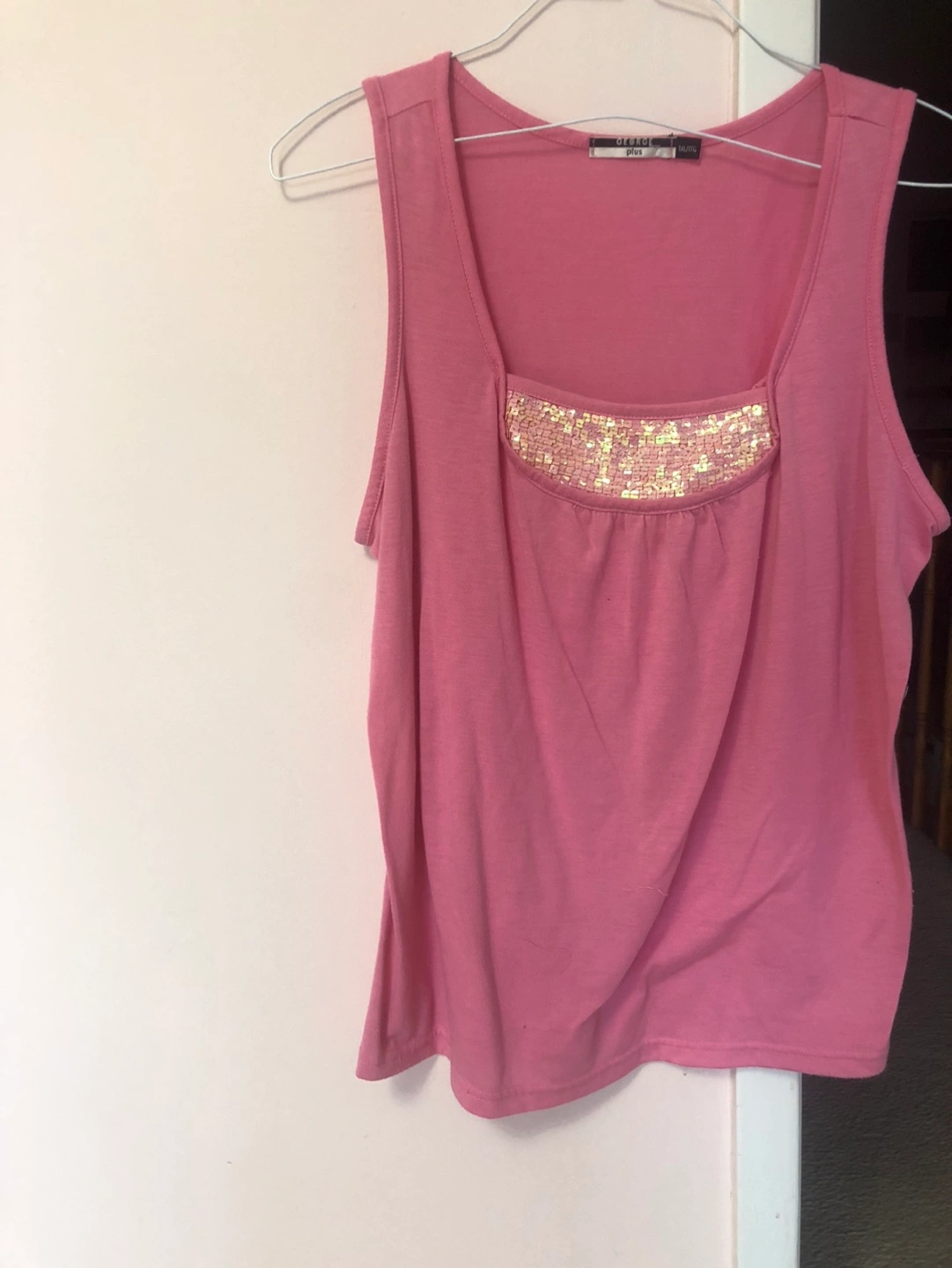 Pink sleeveless top. Features a sequined detail at the neckline. Plus size.