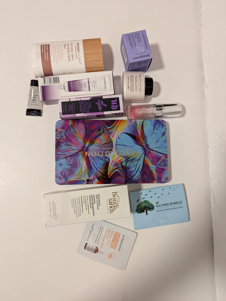 Assorted beauty products. Includes eyeshadow palette, setting spray, baking powder, deodorant, and more. Brands represented: Revolution, Covergirl, Raw Sugar, Bondi Sands, Cocokind, and others. Pick up near Birchmount/Ellesmere. Cash only.