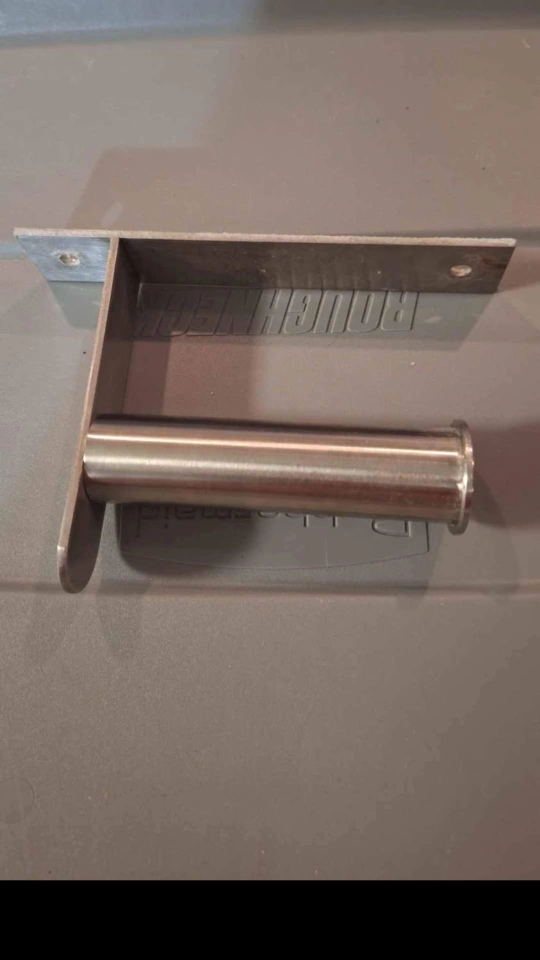 Wall-mounted toilet paper holder. Stainless steel construction. Simple design. Includes mounting hardware. Good condition.