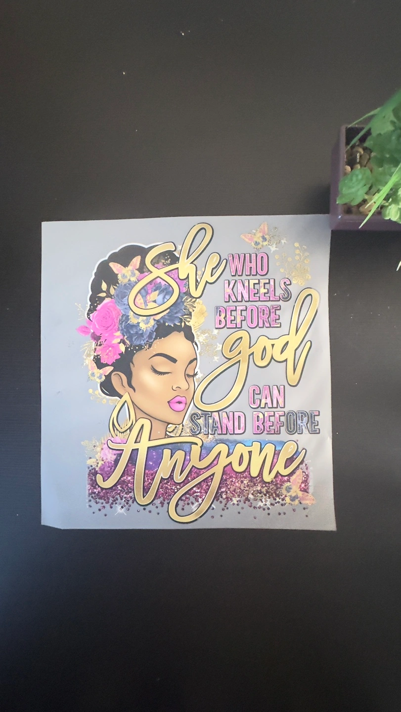 Set of beautiful DTF transfers. Designs feature strong Black women with inspirational quotes. Perfect for t-shirts,tote bags, and more. Ready to use. High-quality prints.