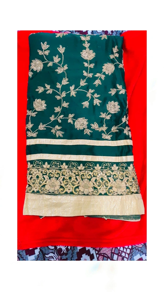 Beautiful embroidered three-piece unstich suit. Dark green top and dupatta, red bottom. Intricate gold embroidery. Stunning detail. Perfect for special occasions.