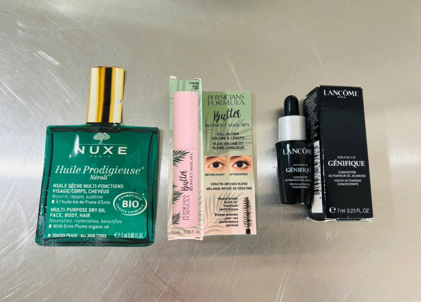 Brand new beauty samples, Includes: Nuxe Huile Prodigieuse dry oil, 2ml. Physicians Formula Butter Blowout mascara.7.3ml Lancôme Advanced Genifique youth activating concentrate. 7ml.