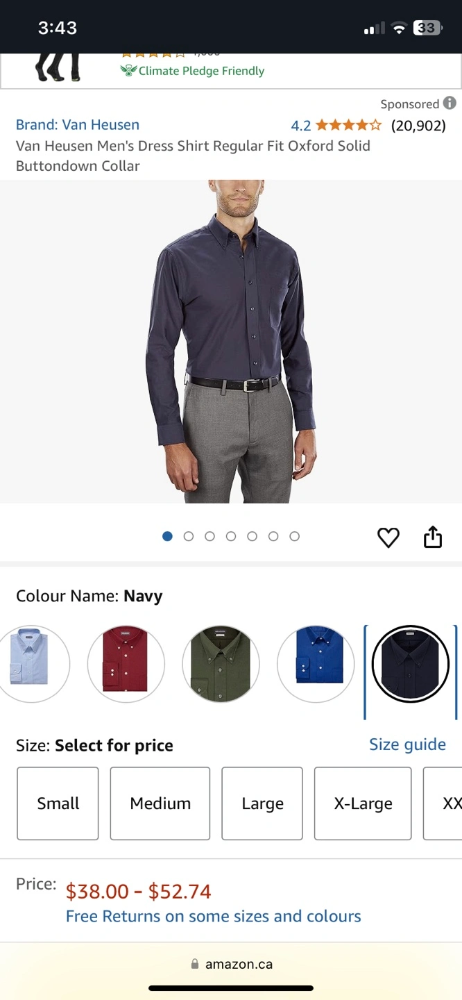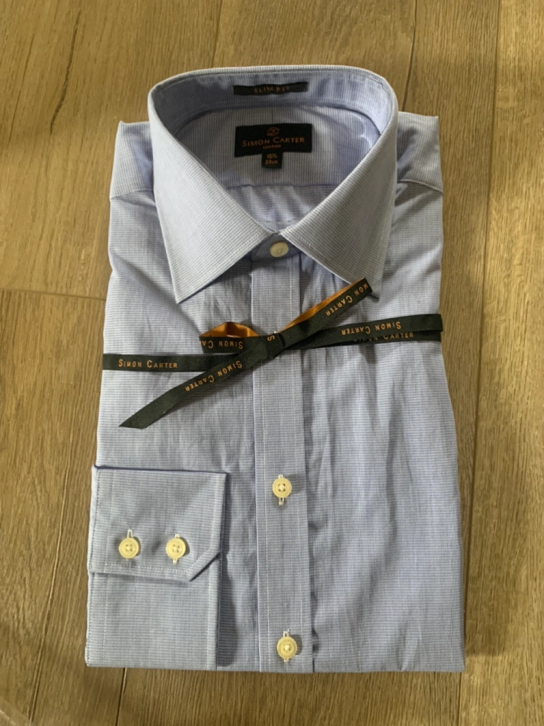 Gently used men's dress shirt. Simon Carter brand. Light blue colour. Regular fit. 100% cotton. Button-down collar. Excellent condition.