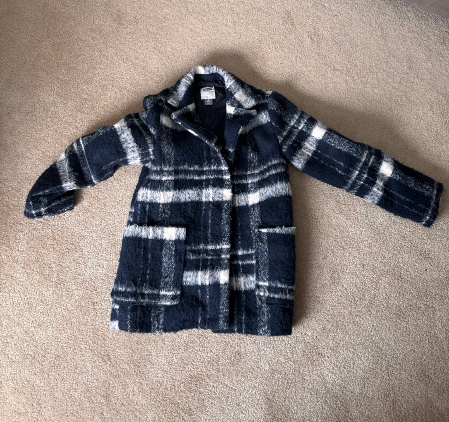 Old Navy lightweight coat - perfect for spring. Black and white plaid pattern. Long sleeves. Two patch pockets. Button front closure.