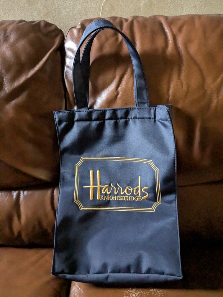 Dark blue Harrods tote bag. Features Harrods logo. Small interior pocket. Reusable shopping bag. Cash only.