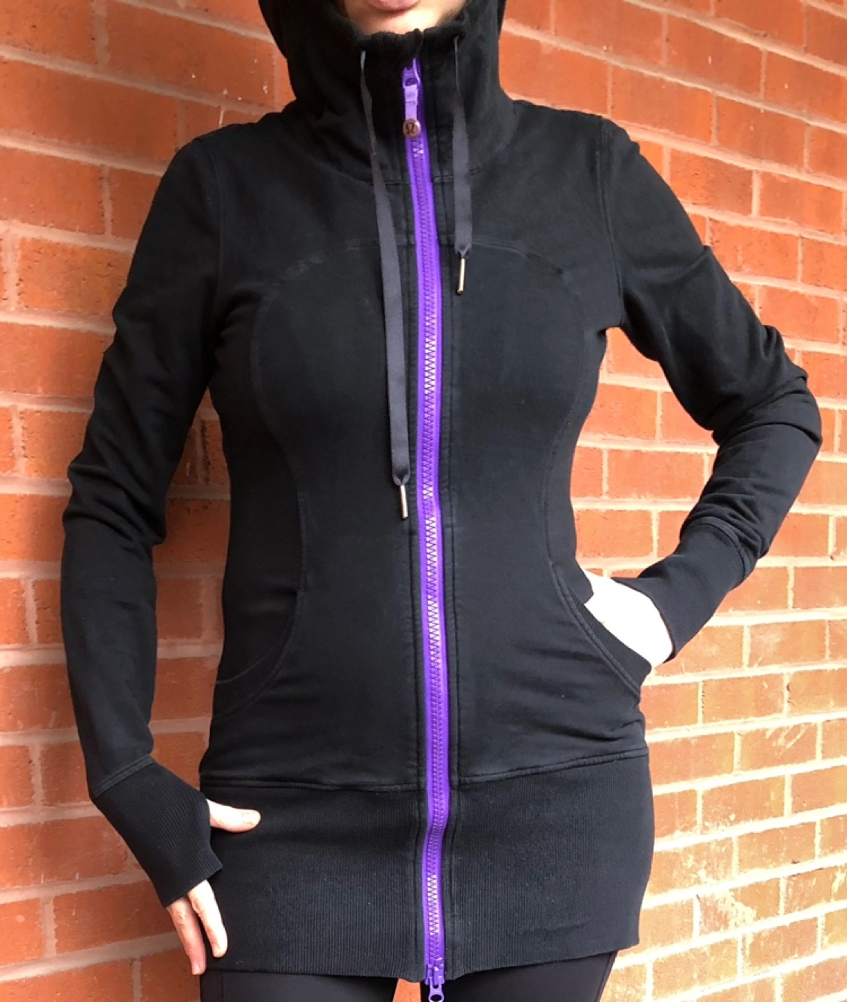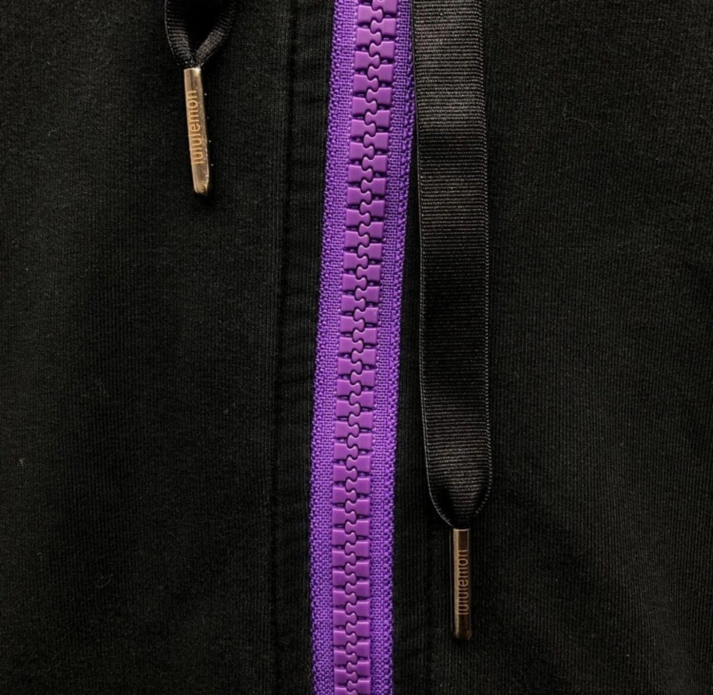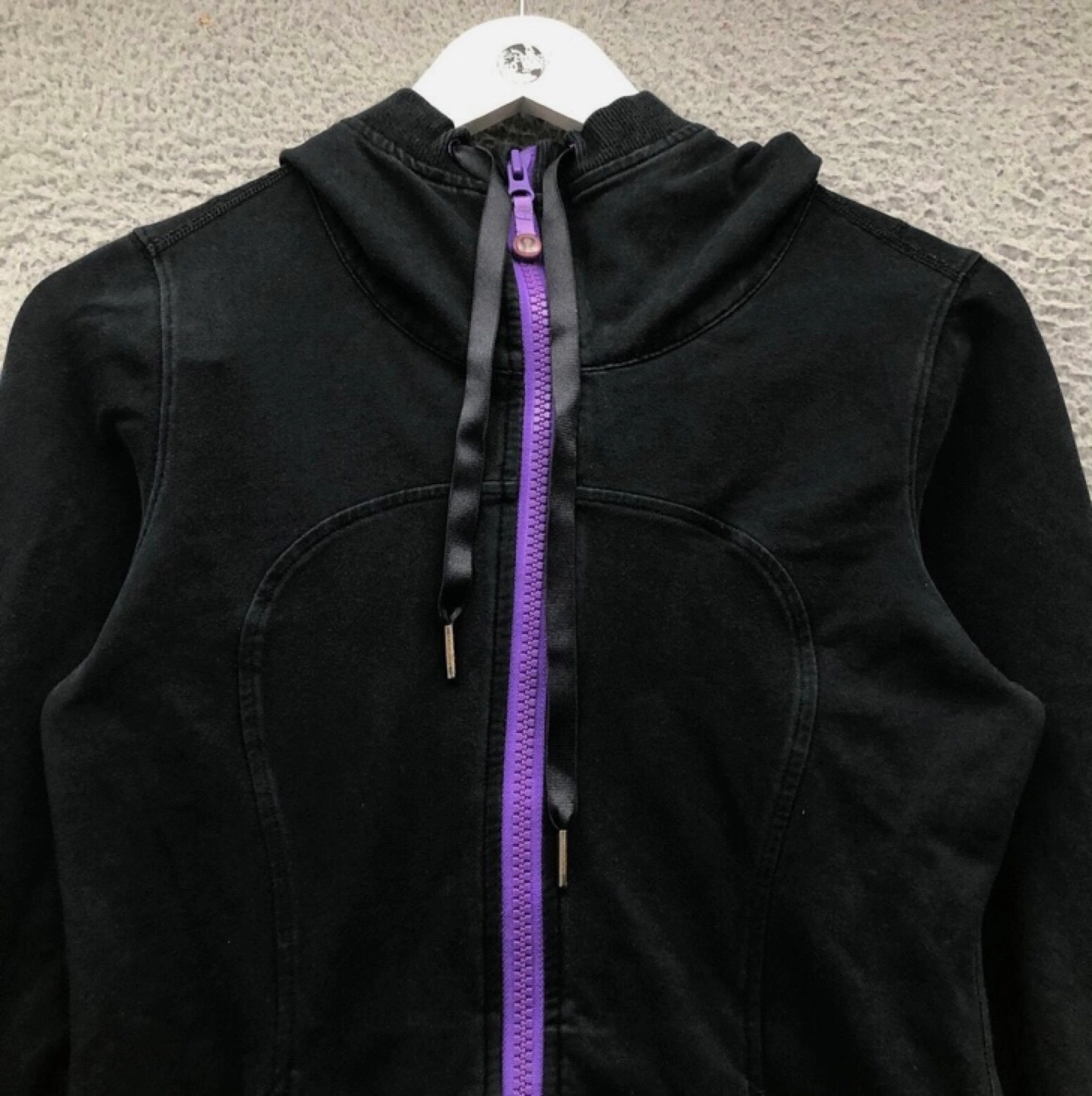 Lululemon Scuba hoodie. Black with purple two way zipper, and purple striped liner inside the hood. Long sleeves with thumbholes. Drawstrings at hood. Two front pockets. Excellent pre-owned condition.